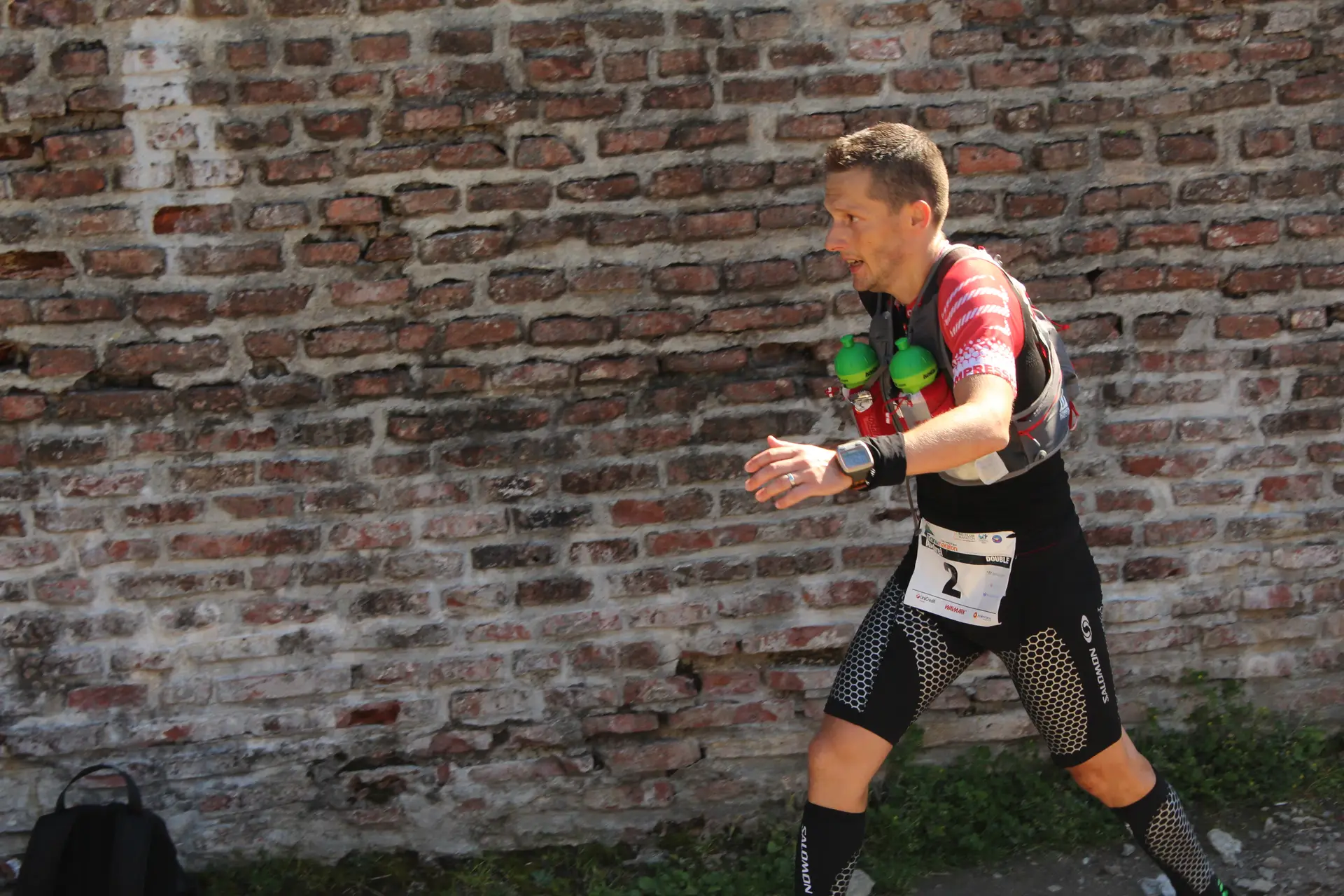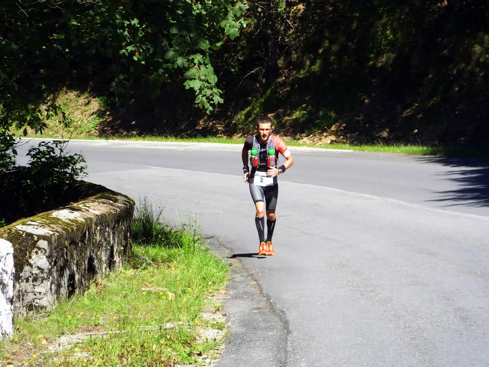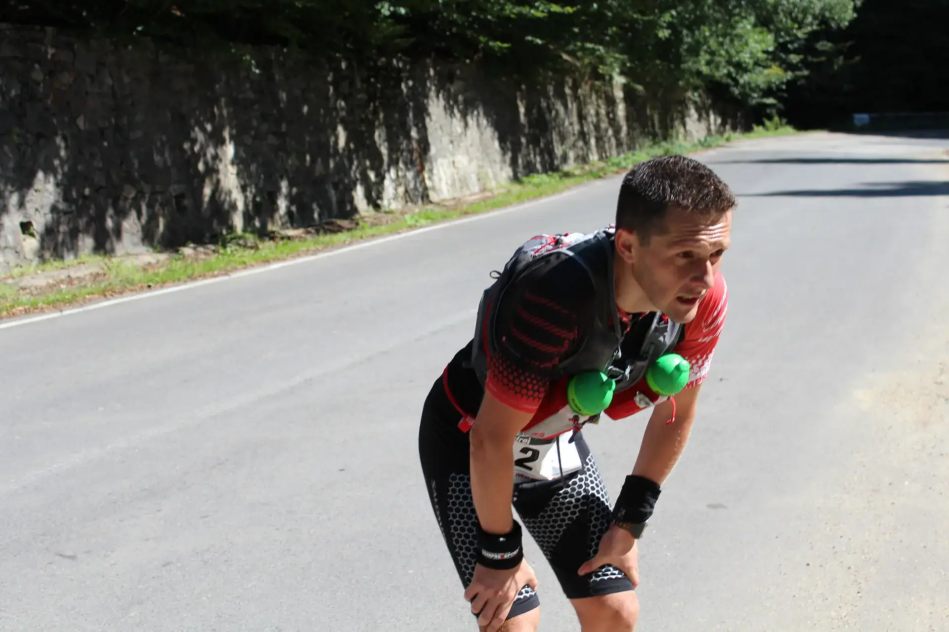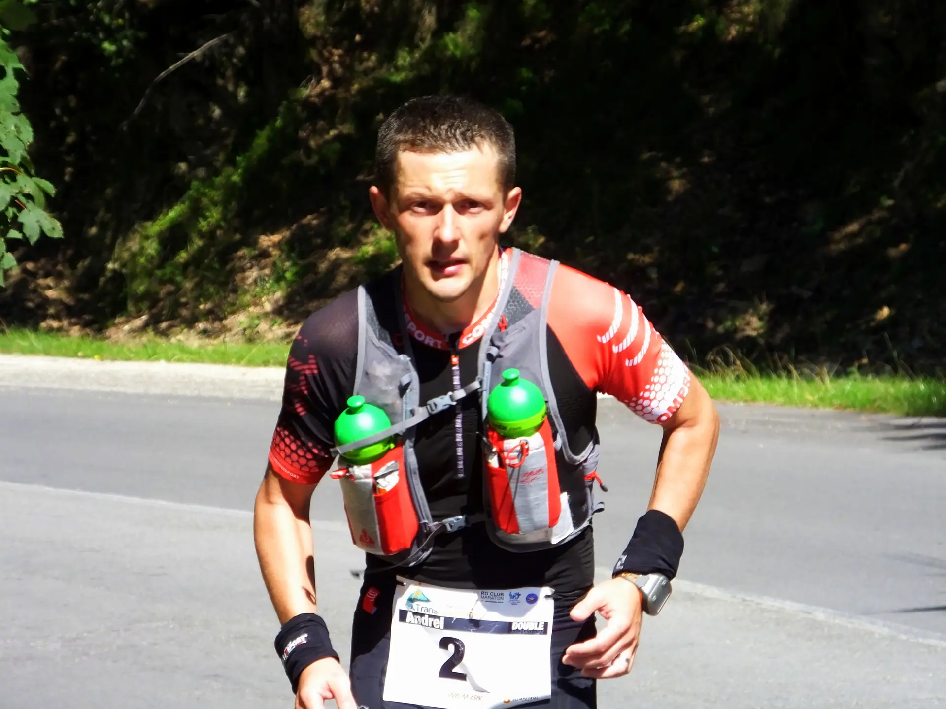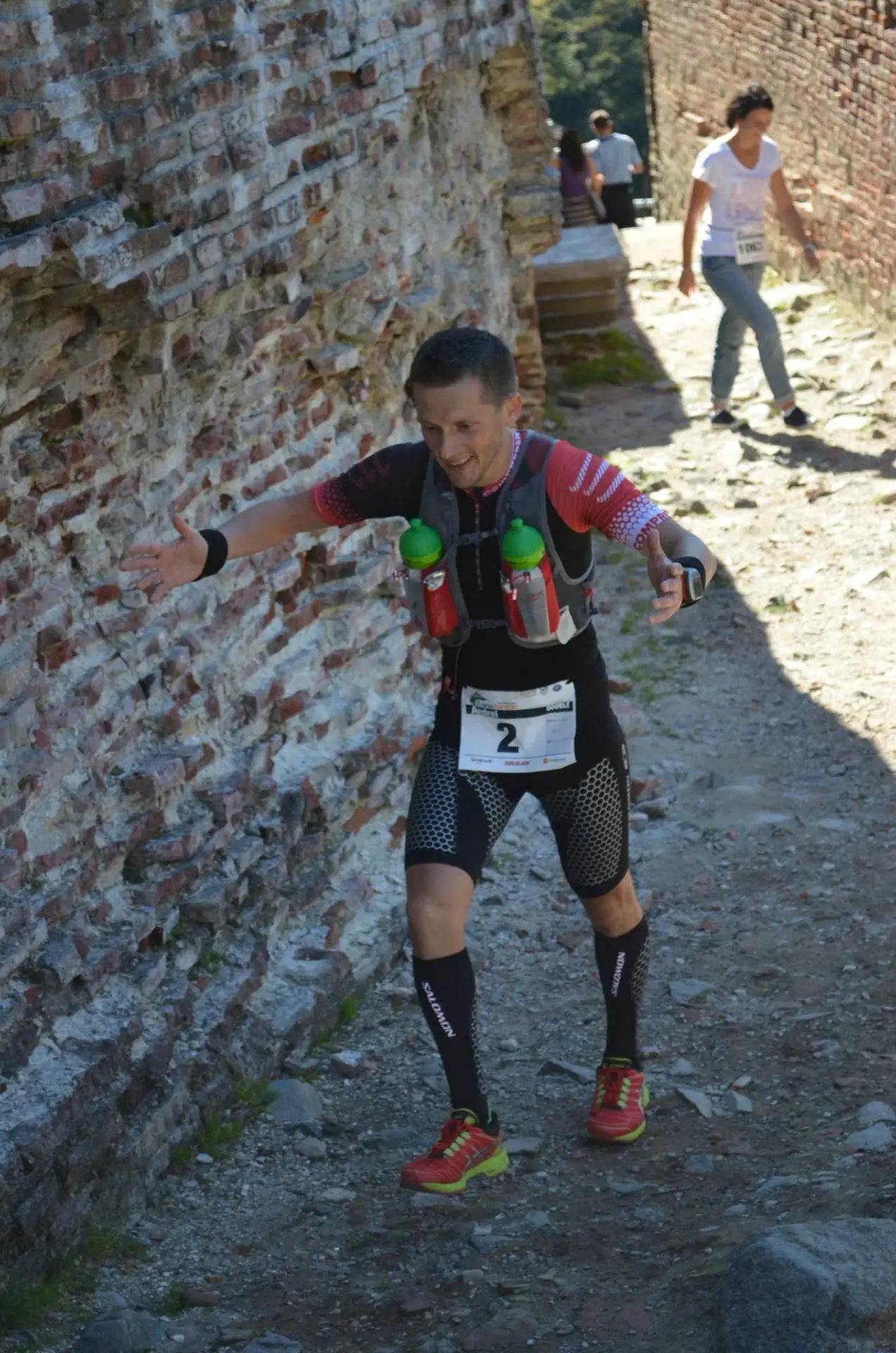 In scurt timp a trecut prin dreptul meu masina in care era Oana Badea si Cristina, sotia mea, impreuna cu doi voluntari. Se indreptau spre Cetatea Poenari pentru a organiza primirea concurentilor si concursul de uprunning pentru insotitori. Nu inainte de a se opri cativa kilometri mai jos si a-mi face poze si a ma incuraja. M-am oprit pentru cateva secunde sa-mi umplu bidonul cu apa si sa-mi trag sufletul dupa care am plecat mai departe. Vederea lor a fost ca o gura de oxigen.