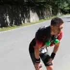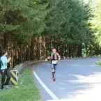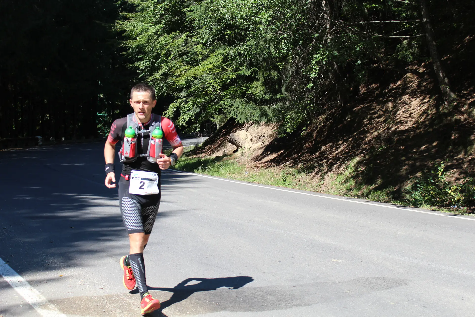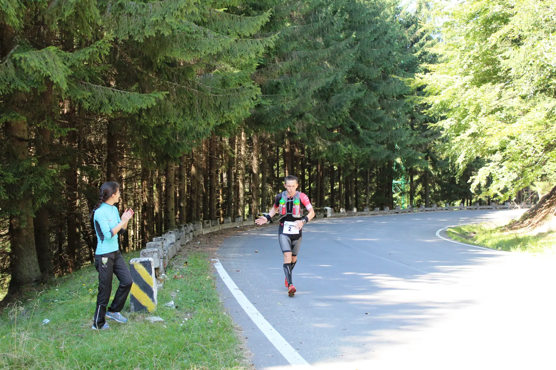 Se facuse deja lumina, iar pe partea sudica soarele scalda cu razele lui soseaua care de sus se vedea ca un sarpe gigant. Pe primii 10 kilometri coborarea era destul de abrupta, panta incepand sa se mai domoleasca putin de abia dupa Cabana Capra. Am incercat sa nu fortez foarte tare pe coborare, desi profilul pantei te indemna sa dai drumul la picioare, insa stiam ca voi plati mai incolo pentru asta si mai aveam de alergat 64 de kilometri + 1480 de trepte 😀 Chiar si asa, cei 10 kilometri de coborare i-am facut in 44 de minute. Deja incepuse sa se incalzeasca si ma hidratam din ce in ce mai des. In buzunarele din fata ale vestei cu care alergam aveam doua bidoane: intr-unul isotonic ISOSTAR si in celalalt apa, pe care voluntarii cu bicicletele sau Gabi Solomon din masina de suport mi le umpleau atunci cand ramaneam fara. Le multumesc mult pentru ajutor. N-am simtit nici un moment in cursa asta ca am nevoie de ceva si nu este cineva langa mine caruia sa-i cer. Suportul voluntarilor a fost senzational!