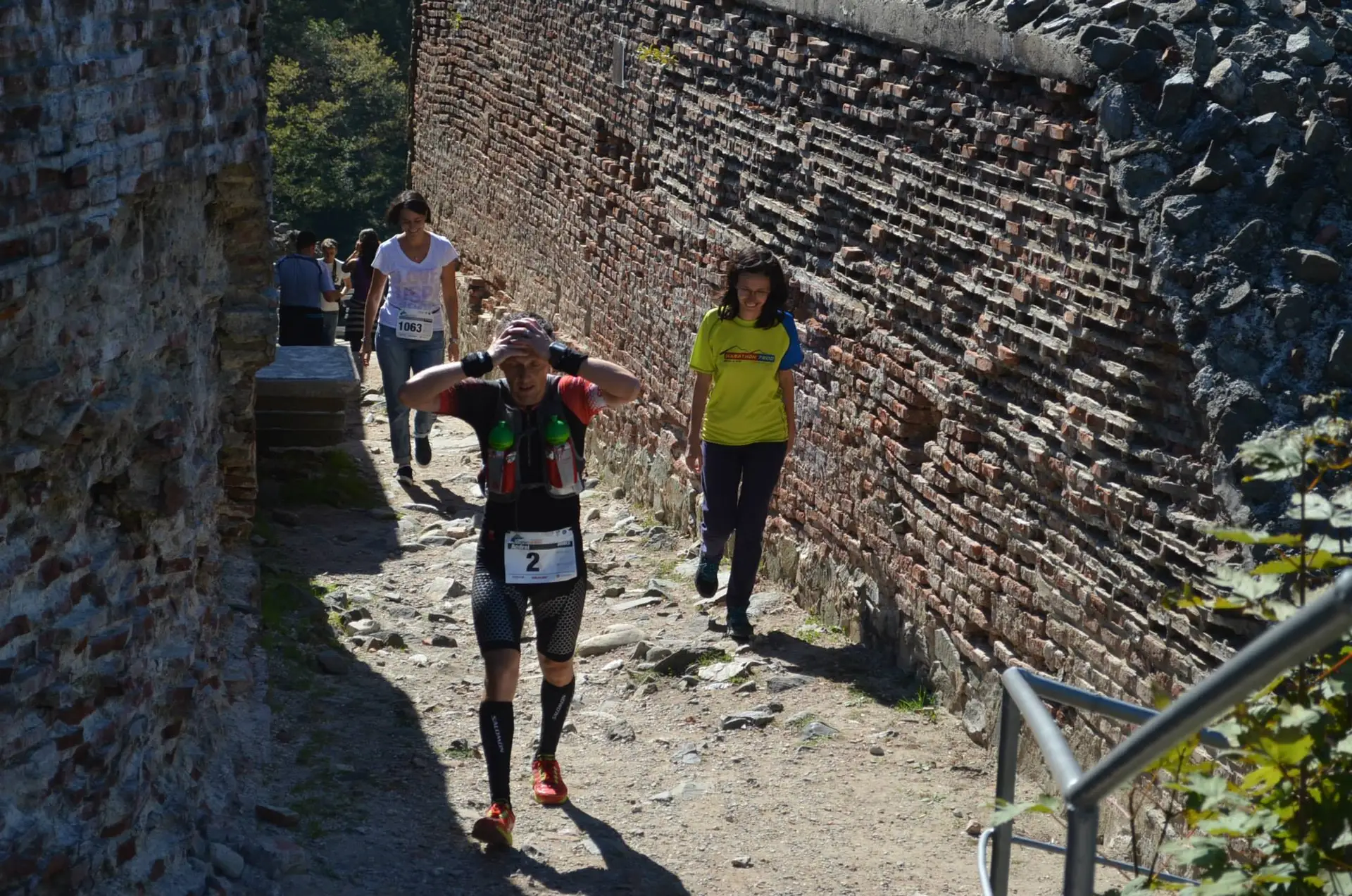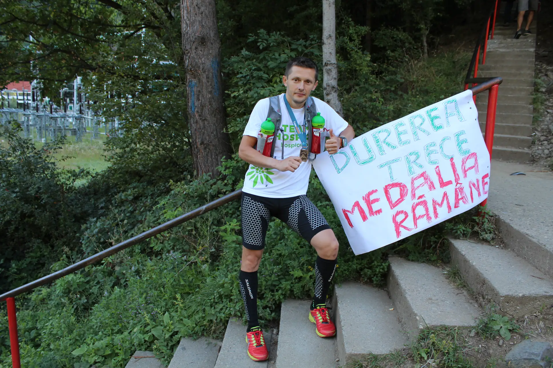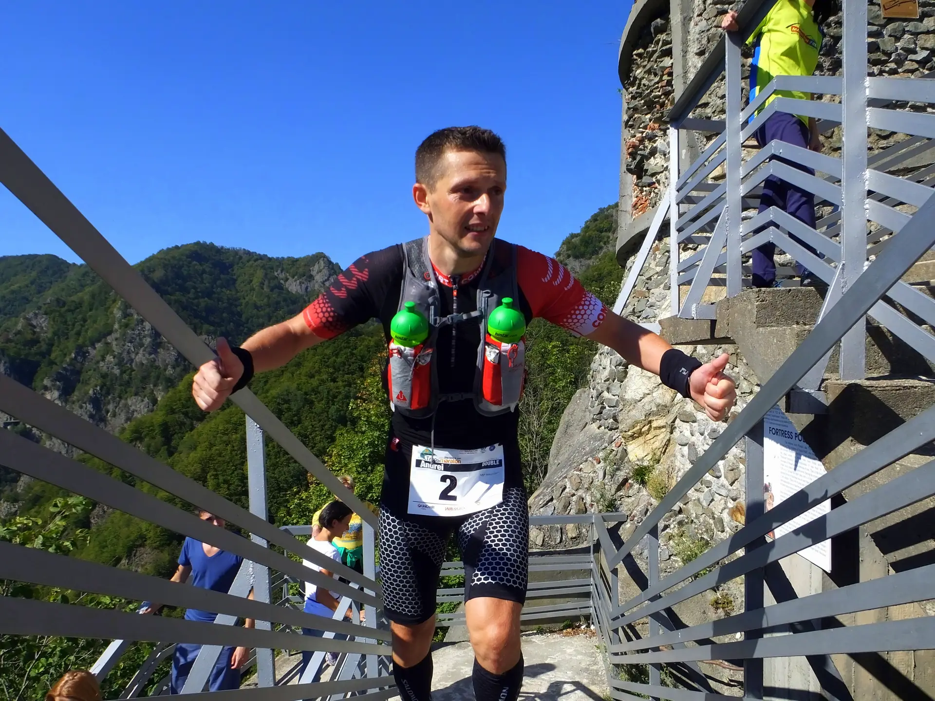 Intr-un final imi ridic privirea din pamant si vad la 400m locul de unde urma sa inceapa urcusul celor 1480 de trepte. Asadar se terminasera cei 84 de kilometri si eu eram inca in picioare, alergand. Aproape mi-au dat lacrimile si-am continuat sa ma apropii iar voluntarii si sustinatorii incepusera sa-mi strige numele si sa ma incurajeze pentru ultima parte a cursei: cele 1480 de trepre. O pancarta mai mult decat incurajatoare ma astepta la baza scarilor: “BRAVO! MAI AI PUTIN: 1480 DE TREPTE!” Pe primele cateva zeci am inceput sa le urc in alergare insa foarte curand am realizat ca nu pot sa tin acel ritm pana sus si m-am resemnat in a le urca la pas, dar intr-un ritm sustinut. Pe drum 3 persoane mi-au spus: “Hai ca nu mai ai mult”. Din pacate mai aveam destul, dar erau ele dragute.