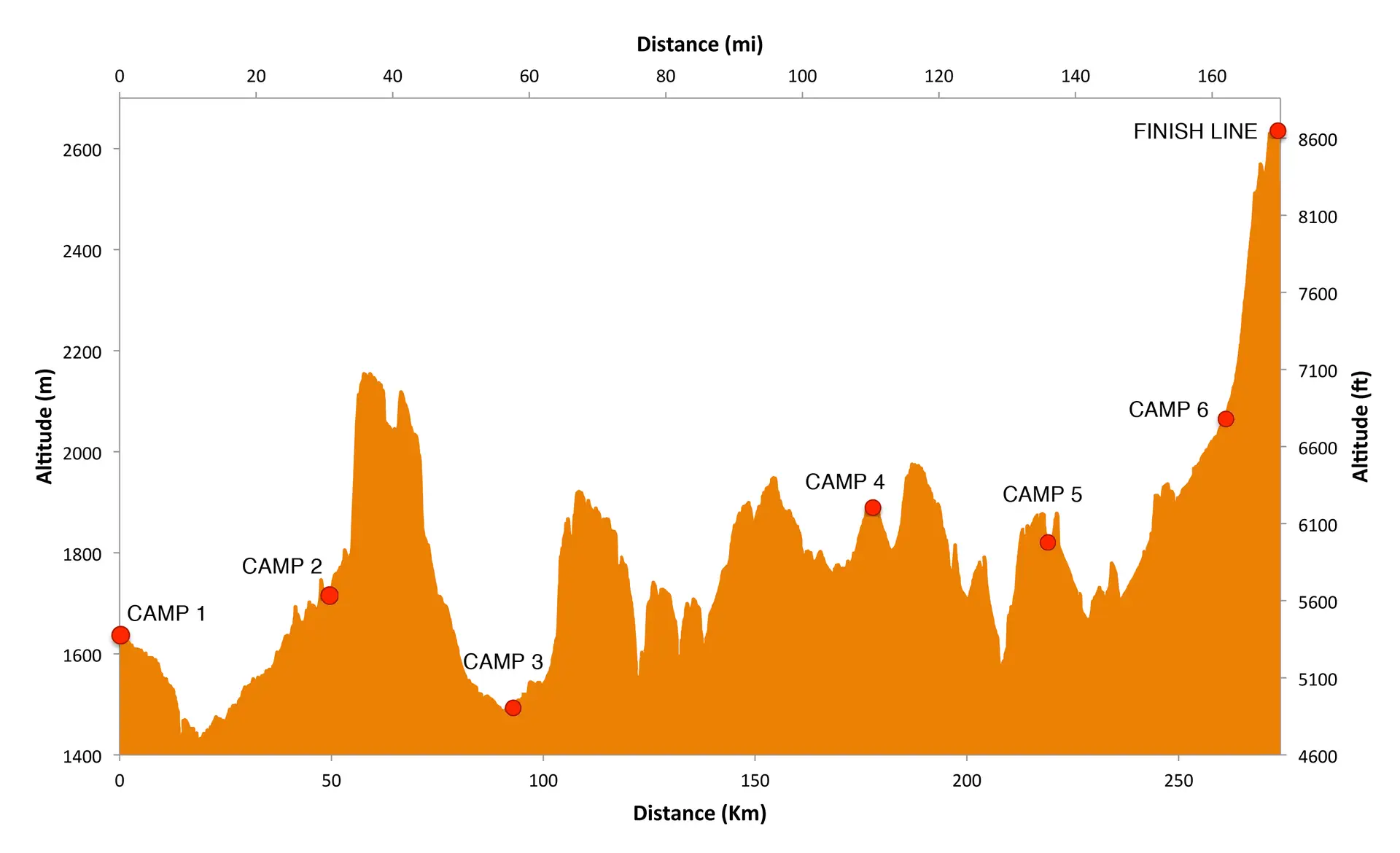 Terenul pe care se va alerga este extrem de variat, un mix de dune de nisip, poteci prin padure, canioane inguste, zone tehnice cu stancarie unde accessul se face catarandu-te cu ajutorul corzilor, etc. Linia de start se afla intr-o zona izolata pe inelul de nord al Marelui Canion, la o altitudine de 1629m, iar linia de sosire pe varful Pink Cliffs, Grand Staircase, la 2651m, de unde participantii pot admira intregul traseu parcurs timp de o saptamana.