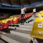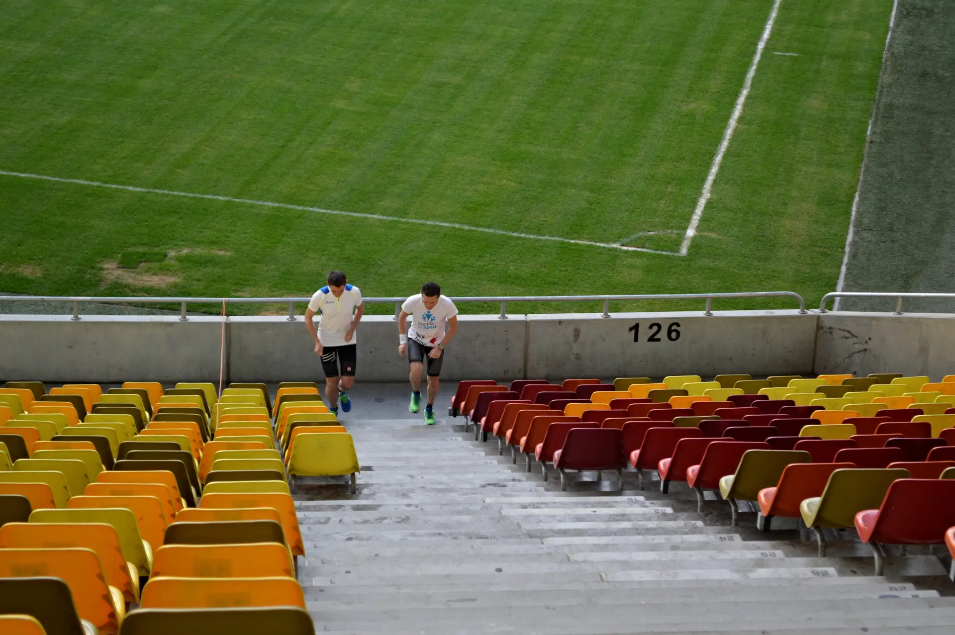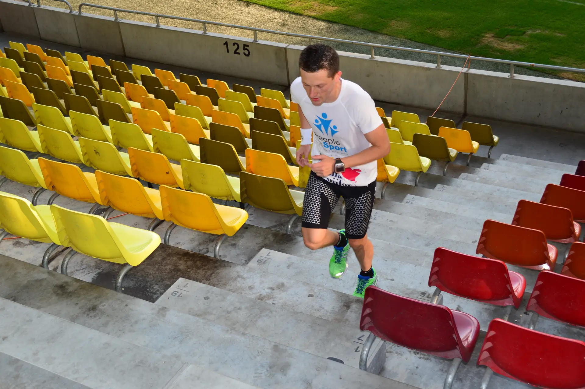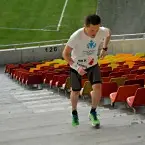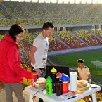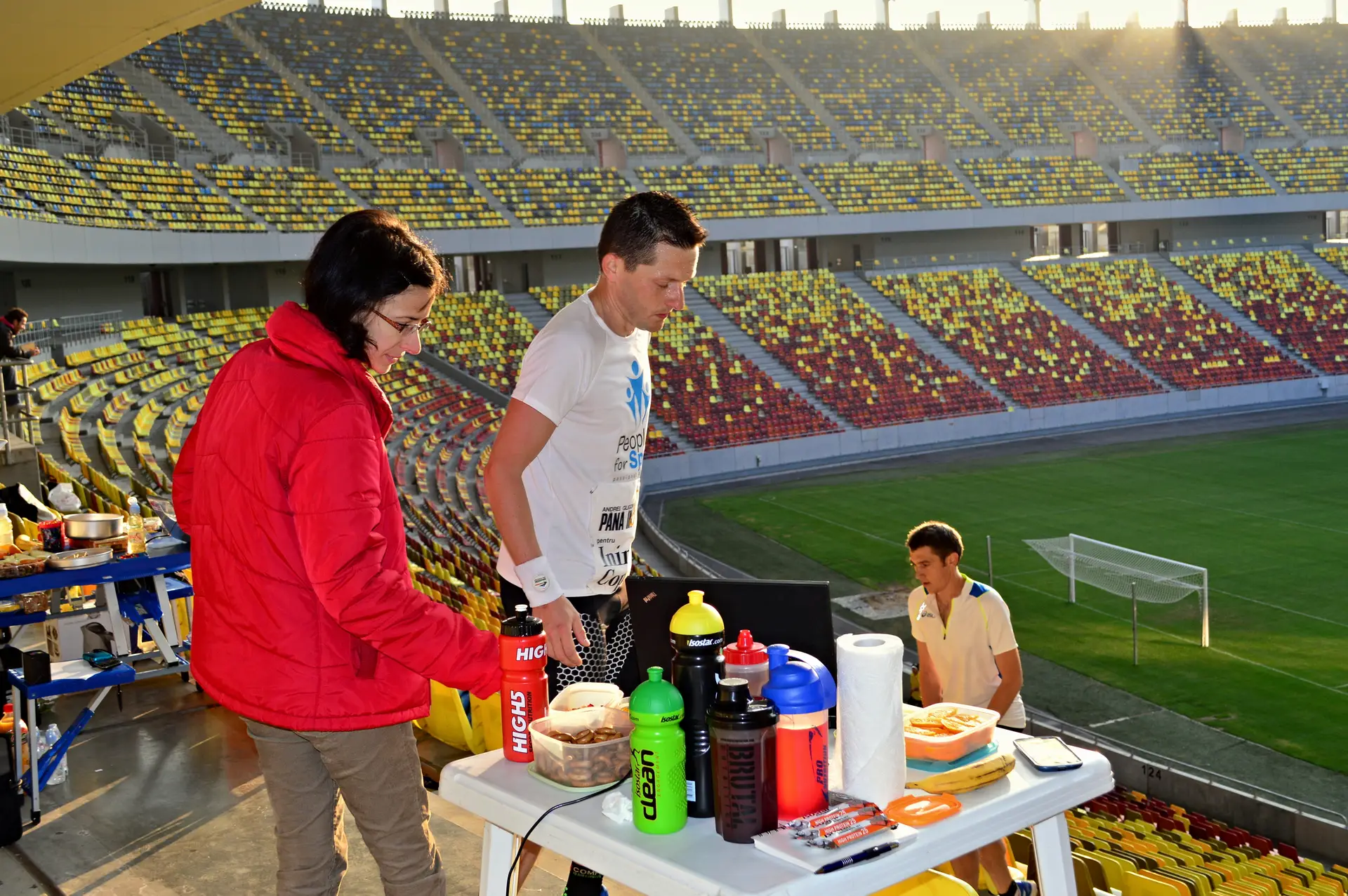La ora 8 eram aliniati, gata de start, pe treptele primului inel din Arena Nationala. Culoarul pe care aveam sa alerg 6 ore sus-jos, jos-sus avea 69 de trepte si o diferenta de nivel de 10,08m (masurata la milimetru, cu rigla, de Oana Badea). Asadar calculele erau simple. La 100 de urcari, aveau sa fie 1000m pe verticala. Primele 2-3 ore au fost relativ usoare spun eu, chiar ne tineam de glume gandindu-ne cand vom trece prin dreptul altitudinii Vf.Omu, cand vom ajunge la Mont Blanc, etc. Starea de spirit era buna, iar cei care erau alaturi de noi din echipele de suport, dar si fotografi si cameramani, ne incurajau la tot pasul. Multumesc sotiei mele, care si de data aceasta mi-a fost alaturi 🙂