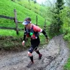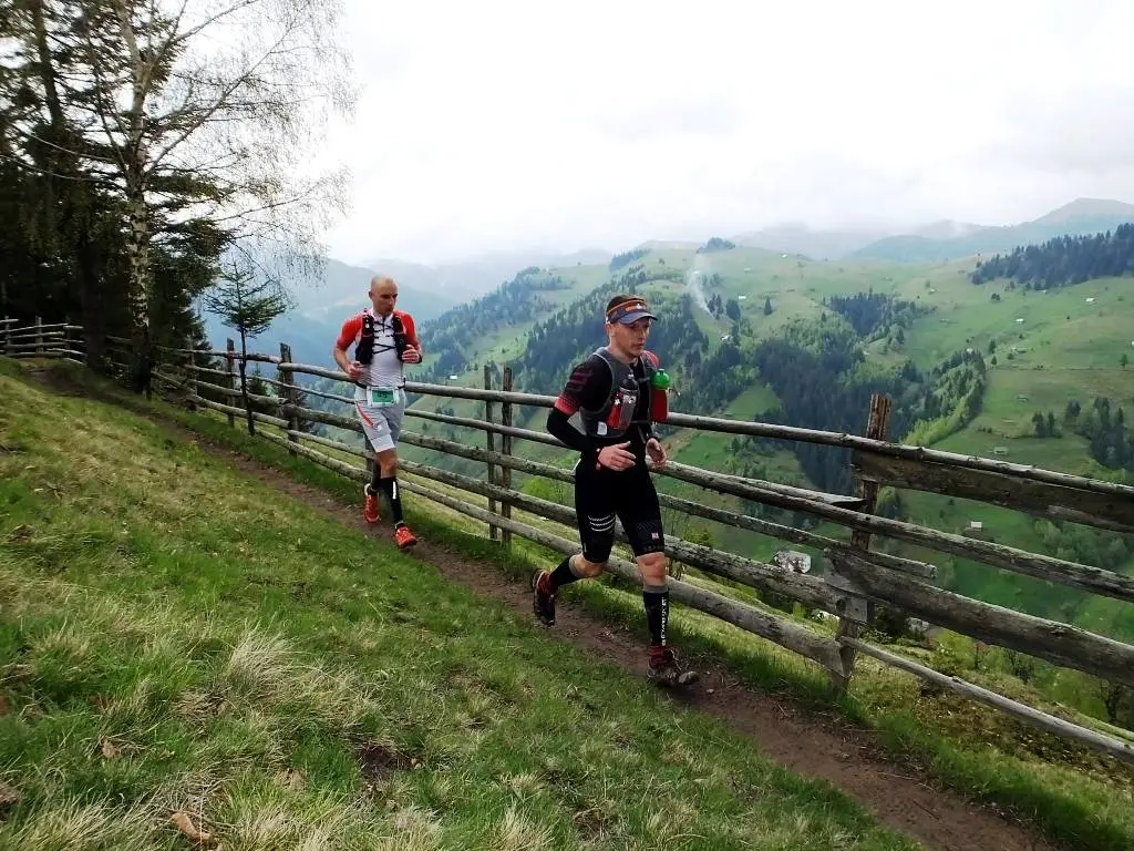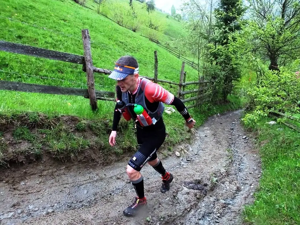 Incepuse sa ploua de ceva vreme insa de abia atunci bagasem de seama, fiind “furat” de frumusetea locurilor. Bucla a doua a inceput direct cu o urcare de aproximativ 1,5km si 350m diferenta de nivel, pe o poteca ingusta si dificil de alergat din cauza noroiului care trecea de glezna in unele zone. Pe la kilometrul 20 contracturile din zona lombara pe care le-am adus acasa din Sahara, au inceput sa-si faca de cap si in scurt timp coborarile incepusera sa devina un chin. Imi parea rau pentru ca nu puteam sa dau tot ce pot pe coborari si sa recuperez astfel din timpul pierdut pe urcari, unde trebuie sa recunosc ca nu sunt “the king of the mountain”. Insa cum in orice cursa de maraton sau ultramaraton este imposibil sa nu intervina o senzatie de disconfort, de durere, indiferent de ce natura, am hotarat sa strang din dinti si sa merg mai departe. Era de abia jumatatea cursei si nici prin cap nu-mi trecea sa ma opresc dupa a doua bucla.