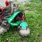 Dupa ceasul meu mai erau 2-3 kilometri. Continuam sa alerg, cu Mihai pe urmele mele, cand am realizat ca e posibil, daca acceleram un pic, sa terminam cursa sub 6 ore. I-am strigat si lui Mihai in spate ca putem sa o facem si am dat drumul la picioare coborand cu viteza si depasind cativa alergatori. Poteci inguste prin padure, poienite si fanete de un verde ireal, traseul continua sa coboare, uneori mai abrupt, alteori mai lin. Parca nu mai simteam nici o durere iar energia imi revenise ca prin minune. Se auzea vocea organizatorilor care anuntau prin statie sosirea alergatorilor, semn ca eram foarte aproape. Ultima coborare, ultimul podet de lemn peste care am trecut in fuga si ultimii 200m de asfalt pana la finish. Cand am simtit asfaltul sub picioare, nu m-am gandit decat la un singur lucru. Sa sprintez cat ma tin picioarele spre finish. Si Dumnezeu stie de unde am mai avut resurse, insa in timpul acelui sprint nebun am avut curiozitatea sa arunc o scurta privire catre ceas care indica ritmul de 2m35s/km! Am trecut linia de sosire in 5h53m si-am fost rasplatit cu aplauzele spectatorilor si o medalie frumoasa si muncita rau 😀