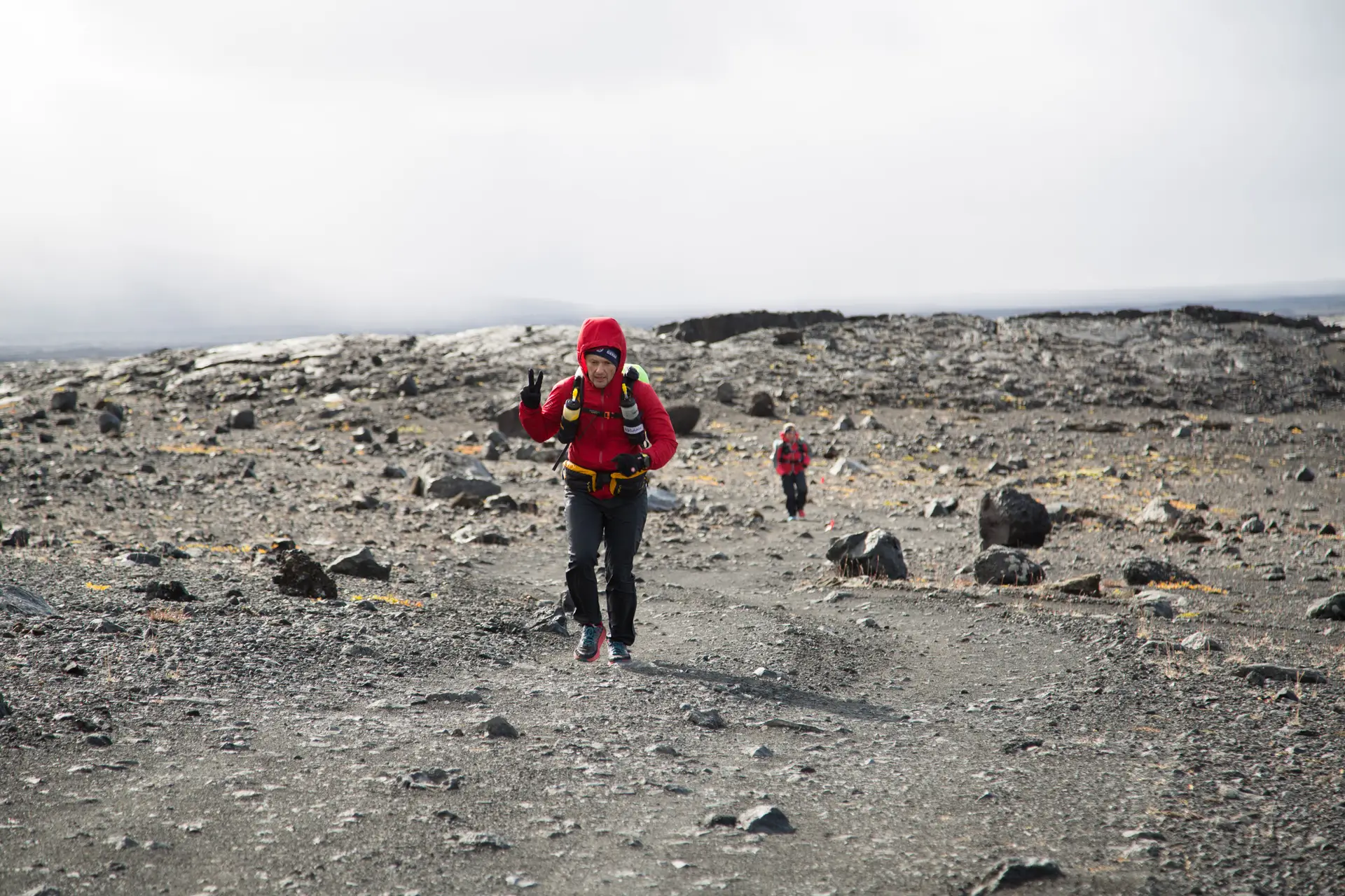 Ca să creionez mai bine imaginea de ansamblu a ce se întâmpla aici trebuie să încep cu seara trecută. Când am terminat etapa 1 și am ajuns în tabără era soare, frig și bătea foarte tare vântul. Atât de tare încât organizatorii nu reușiseră să monteze decât 3 corturi din cele 8. Cortul 6, unde trebuia să intru eu nu era montat. Pentru că bătea vântul ne-au înghesuit pe toți cei care sosisem până atunci în corturile 1, 2 și 3 să ne dăm jos hainele ude și să ne schimbăm. Mai târziu s-a pornit o furtună de, nu pot să spun nisip, ci cenușă vulcanică, pentru că asta avem aici. Este foarte fină și taie ca sticla. Doar nu degeaba chestia asta poate doborî avioane. Derulez pe repede înainte. Momentul somnului. Dau să umflu salteaua și văd două găuri mari în ea. Nu știu cum s-au făcut. Le-am astupat cu bandă izolatoare și am crezut că am reușit însă se desumfla în 15 min. Probabil că mai erau și alte găuri mai mici care nu se vedeau cu ochiul liber. Așadar din jumătate în jumătate de oră m-am trezit să umflu salteaua pentru că era extrem de rece fără. Și dormeam cu două perechi de șosete, doi pantaloni, două bluze, geacă, mănuși și căciulă. Cu astea pe mine intram în sacul de dormit. În care mi-am pus și hainele cu care alergasem în prima etapă și care evident nu aveau cum să se usuce. Măcar să nu le iau reci pe mine a doua zi. La 4:30 când am ieșit afară ningea de zor și viscolea. De frig nu mai zic. Și după ce că salteaua era spartă, mi-am găsit și lucrurile din sacul de dormit ude pentru că se făcuse condens în cort și picura cine știe de când pe sacul de dormit.