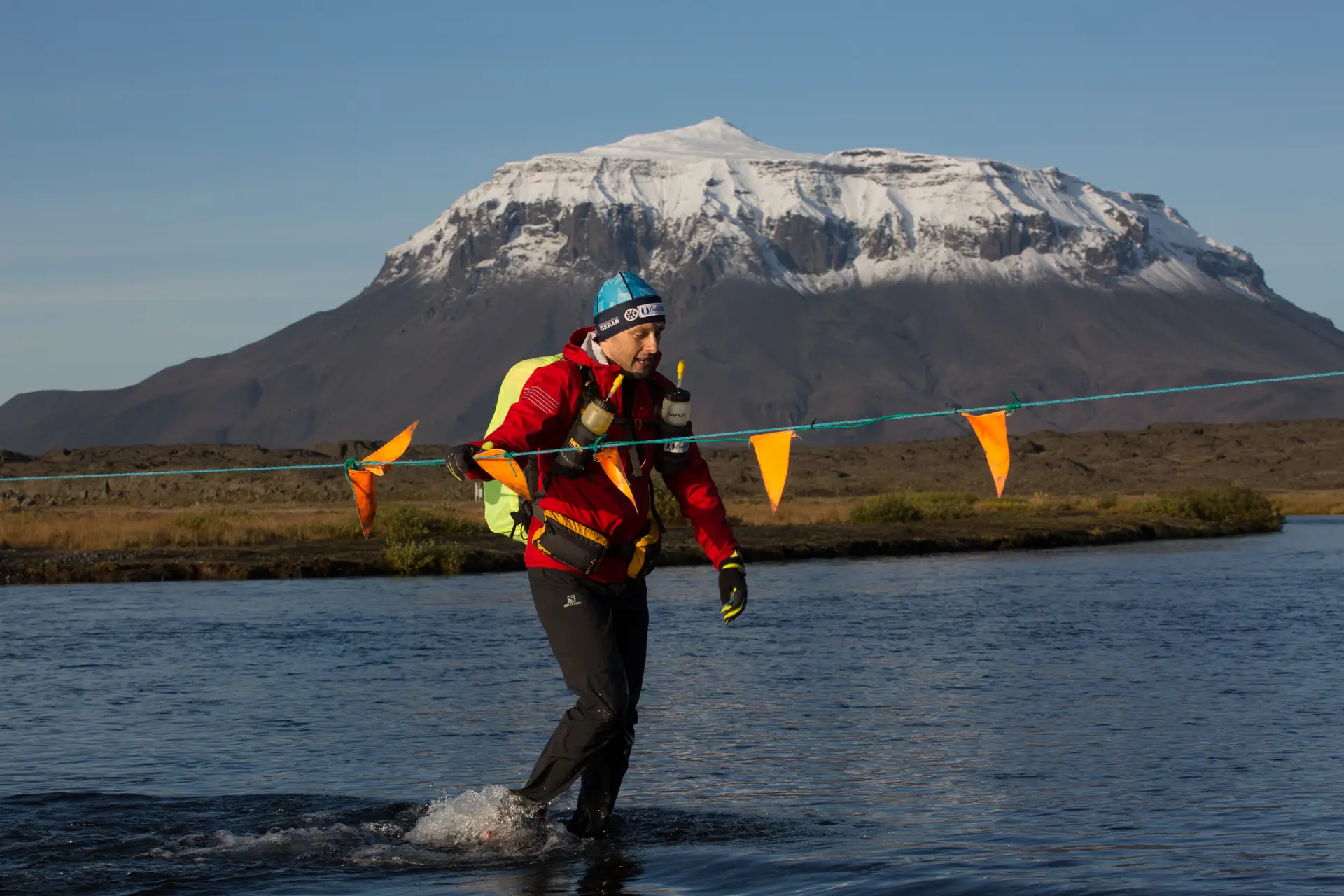 Startul s-a dat azi la 7. Urmau 70 de km de câmpuri de lavă, dune, în așa numita zonă Little Sahara, apoi kilometri nesfârșiți de rocă vulcanică ascuțită prin care trebuia să faci slalom, drumuri offroad pe care treceau la o jumătate de oră câte o mașină, peisaje de vis stânga dreapta. Ah și un amănunt important: nu ninsoare, nu ploaie, nu lapoviță. Soare și frig și un vânt care a bătut decent. La kilometrul 5 prima surpriză. Trebuia să trecem printr-un râu ținându-ne de o frânghie cu apă până la genunchi. Super senzație. Afară erau -5C iar apa Dumnezeu știe cât avea. Oricum dușul ăsta m-a trezit bine. Și a mai fost în meniu o dată la km 21. Toată cursa a fost o fugăreală între cei din top 15. Ne-am vânat și ne-am depășit unii pe alții ca în filmele cu James Bond.