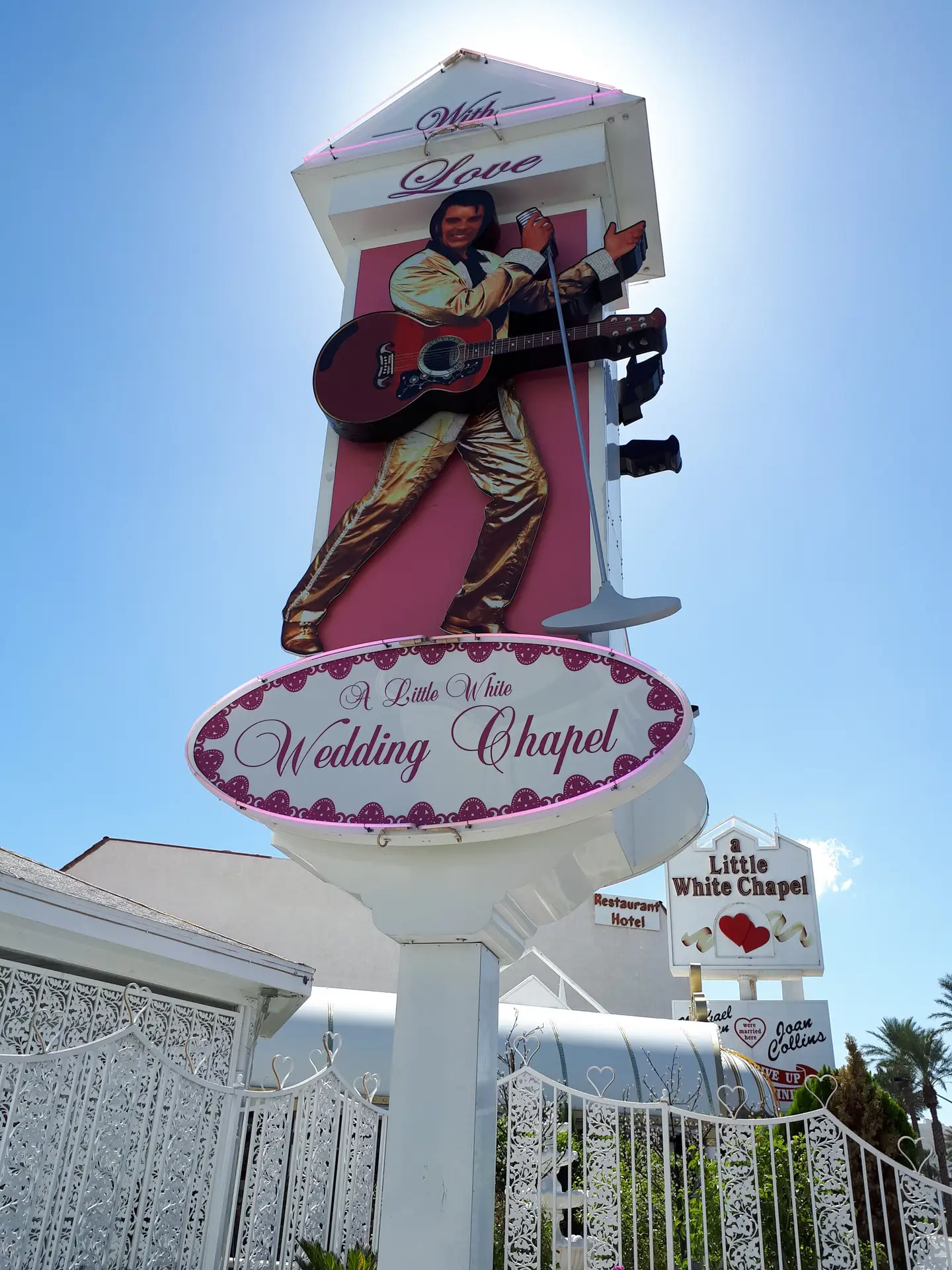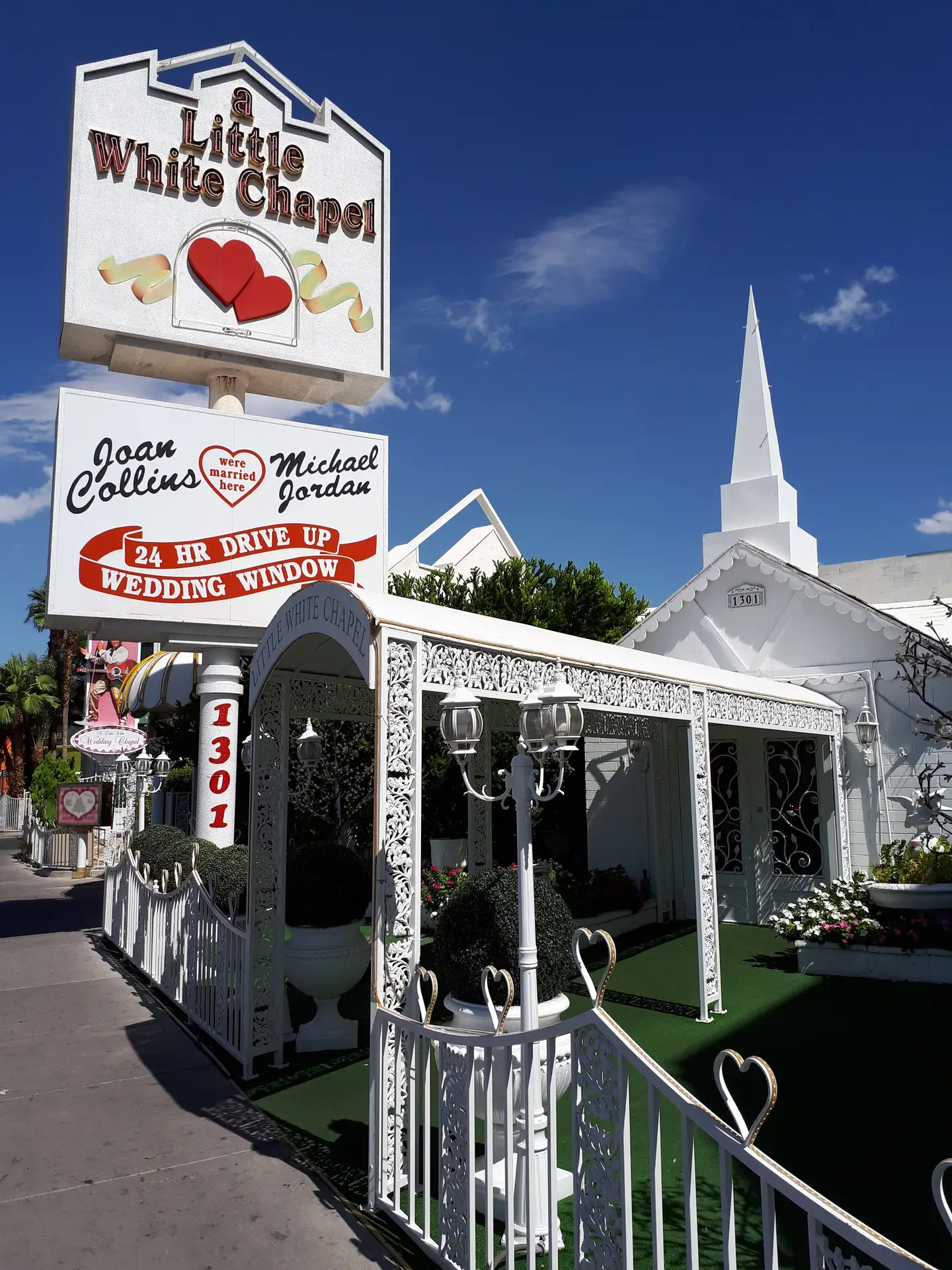 Pe drum am trecut pe lângă The Little White Wedding Chapel, capela unde s-a căsătorit Elvis Presley și Michael Jordan și unde chiar se oficiază căsătorii, deși la prima vedere ai impresia că este aranjată doar pentru a fi vizitată de turiști. Un Cadillac roz cu alb, nu știu dacă era chiar cel avut de Elvis, era parcat în curtea capelei împodobită cu verdeață și ghirlande albe.