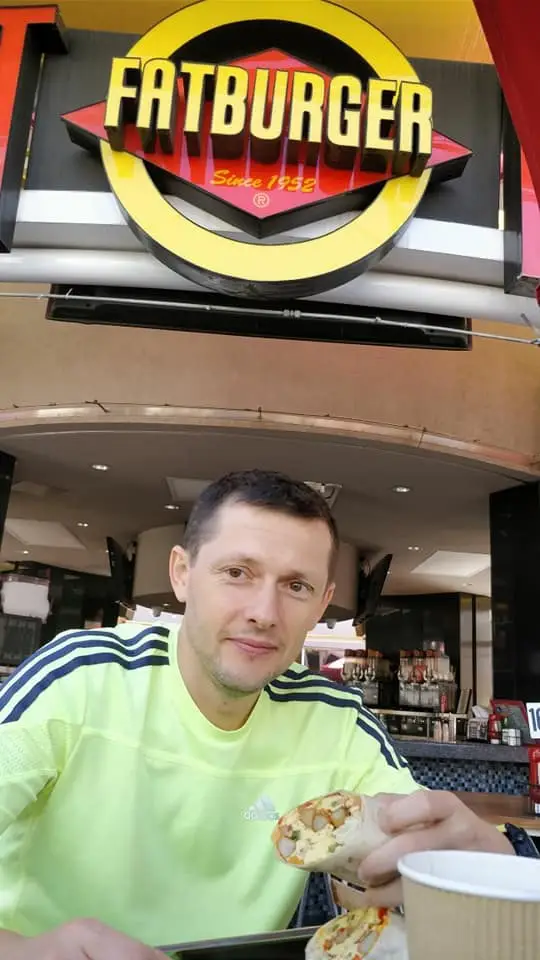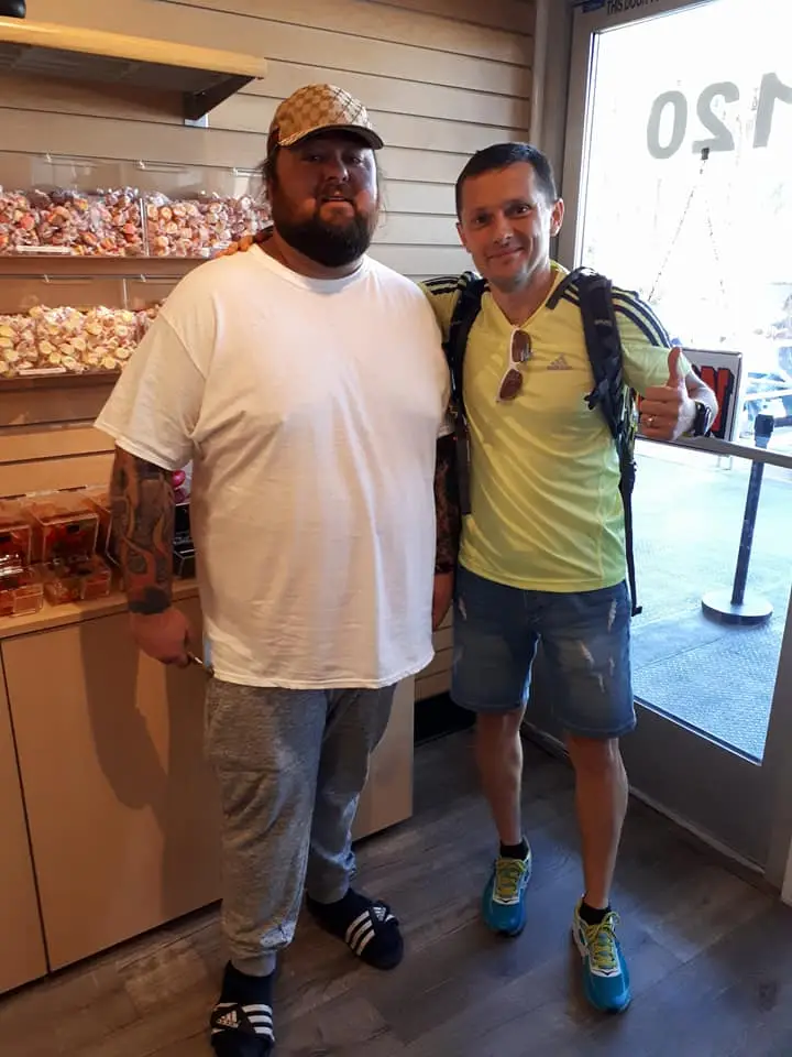 Când mai aveam câțiva metri până la intrare, se deschide ușa și iese chiar Chumlee însoțit de un angajat al casei de amanet, în tricou, pantaloni de trening și papuci cu o atitudine super relaxată vorbind și gesticulând de zor. Traversează și intră într-un magazin mic pe care scria Chumlee Candy Shop, la ușa căruia era o coadă respectabilă. M-am așezat și eu la coadă și din vorbă în vorbă am aflat că o dată pe zi omul venea acolo și dădea autografe sau puteai să faci poze cu el, dacă bineînțeles cumpărai ceva din magazinul lui. Super ocazie mi-am spus și am așteptat cuminte să îmi vină rândul. După 10 minute Chumlee deschide ușa magazinului și mă poftește înăuntru. Am dat mâna și i-am spus: “Am călătorit 10.000km, tocmai din România pentru asta”. Mi-a zâmbit și m-a invitat în magazin iar la final am făcut o poză și un filmuleț în care l-am rugat să spună câteva cuvinte pentru fanii showlui din România.