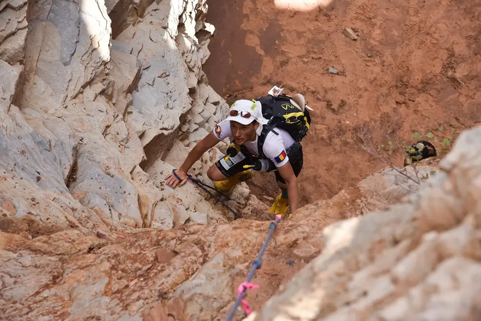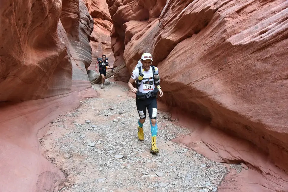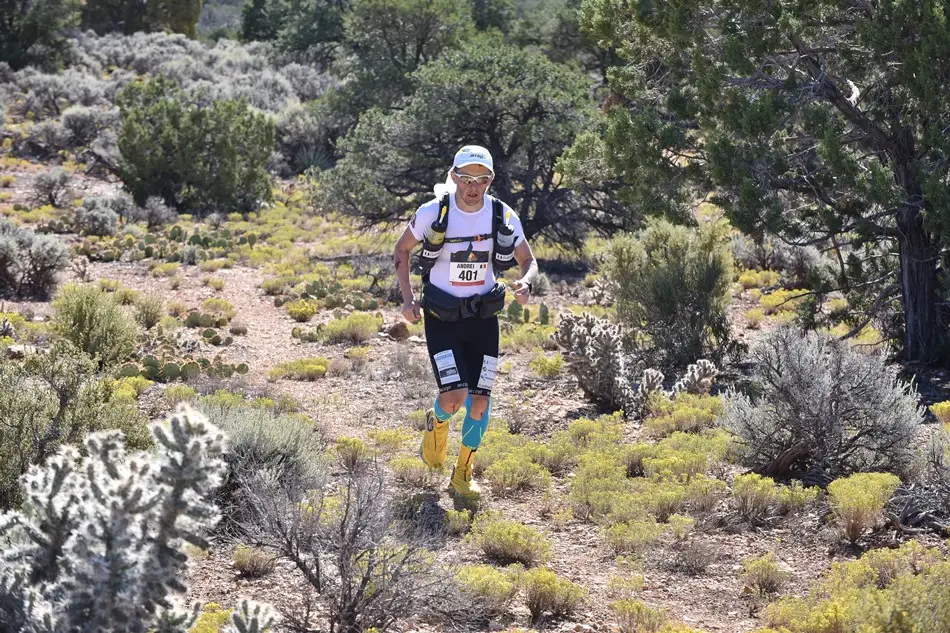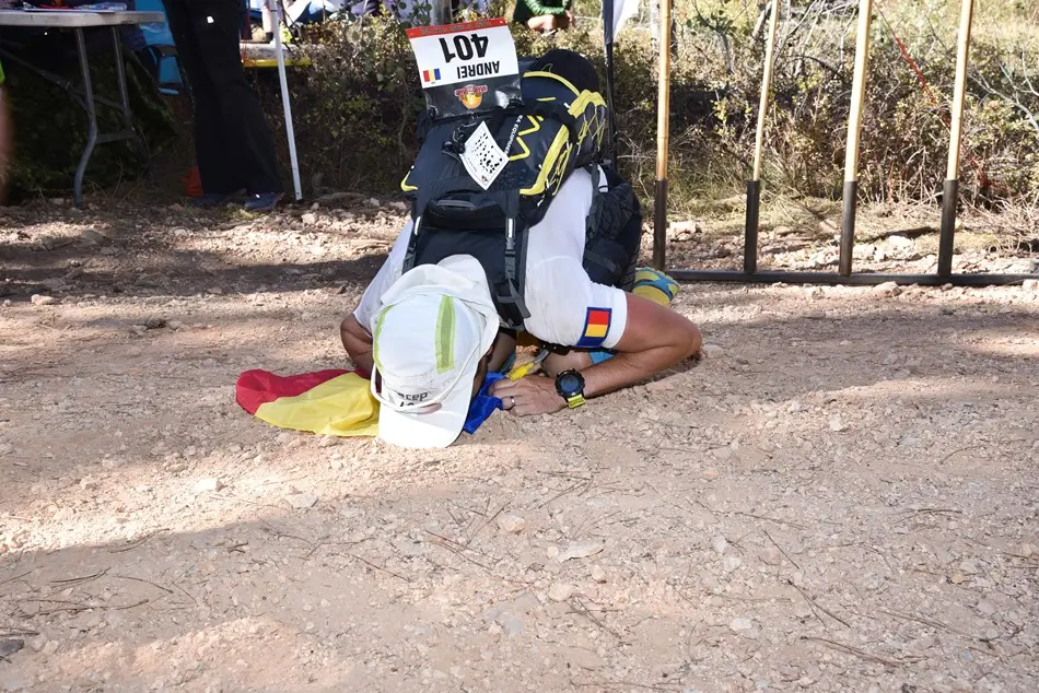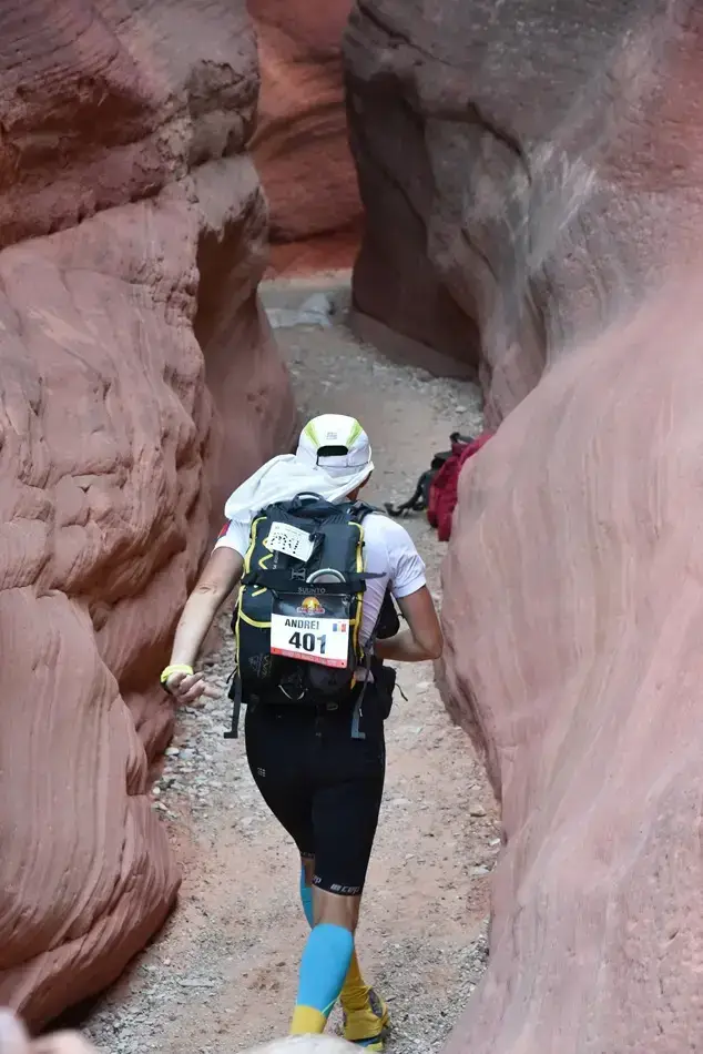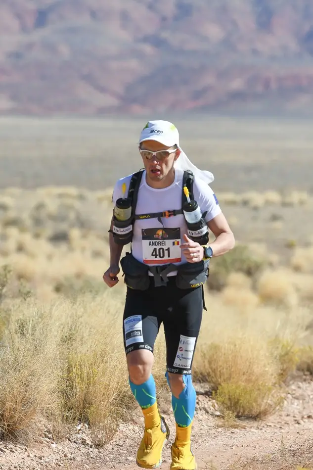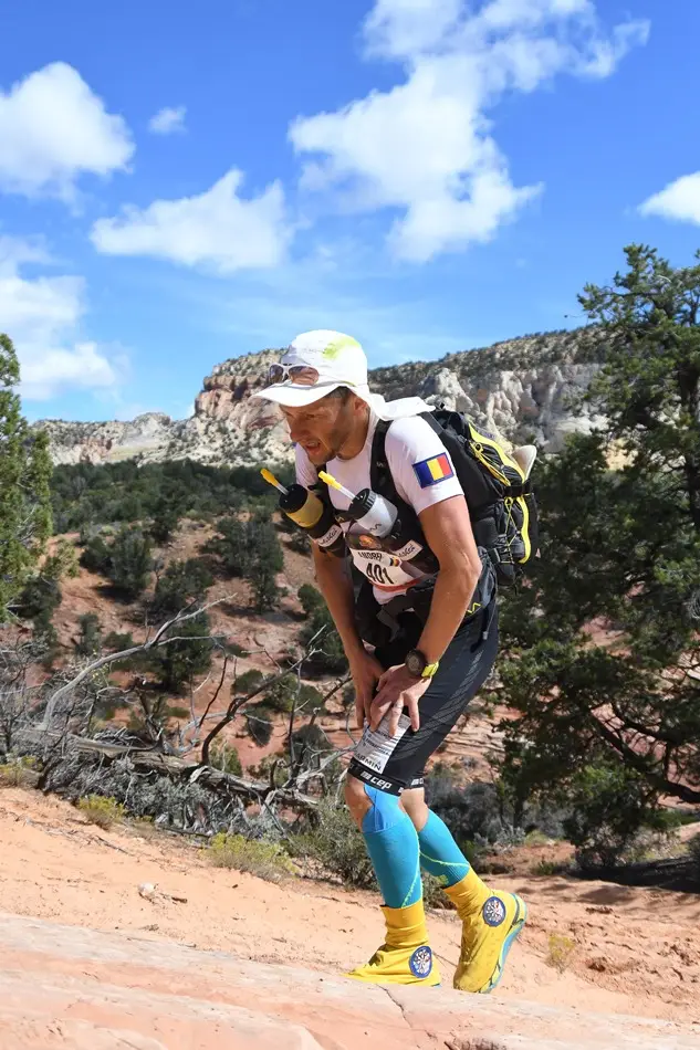 Ca să rezum etapa de astăzi: a fost extrem de cald, majoritatea traseului fiind în câmp deschis în afară de o porțiune de pădure. Am avut o urcare destul de abruptă și tehnică cu bolovani care îți fugeau de sub picioare, exact la început, la km 6. Asta mi-a consumat o mare parte din energie și am tot fost depășit de concurenți iar la un moment dat n-am mai ținut numărătoarea. Eram sigur că sunt al 14-lea sau al 15-lea așa că mare mi-a fost mirarea când am aflat la final că am venit pe 9. Mâine ne așteaptă etapa lungă, 85km de teren extrem de variat. Vom avea de toate: urcări tehnice cu frânghie, canioane înguste, dune de nisip, câmpuri de cactuși, etc. Vestea bună e că genunchiul e perfect (să trăiești 1000 de ani Virgil!). Nu am simțit nici o durere, ceea ce îmi dă speranțe că pot să îmi duc cursa la capăt. Chiar dacă aseară a fost mai bine și am reușit să mă odihnesc pentru că mi-am pus și folia de supraviețuire pe mine pe lângă toate hainele, tot sunt în urmă rău cu somnul. De când am ajuns în USA n-am reușit să mă odihnesc cum trebuie decât o noapte și asta se simte la nivelul de energie pe care îl am în timpul zilei. Vă pup și să ne auzim cu bine după cei 85km de mâine.