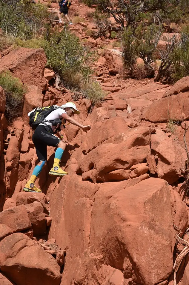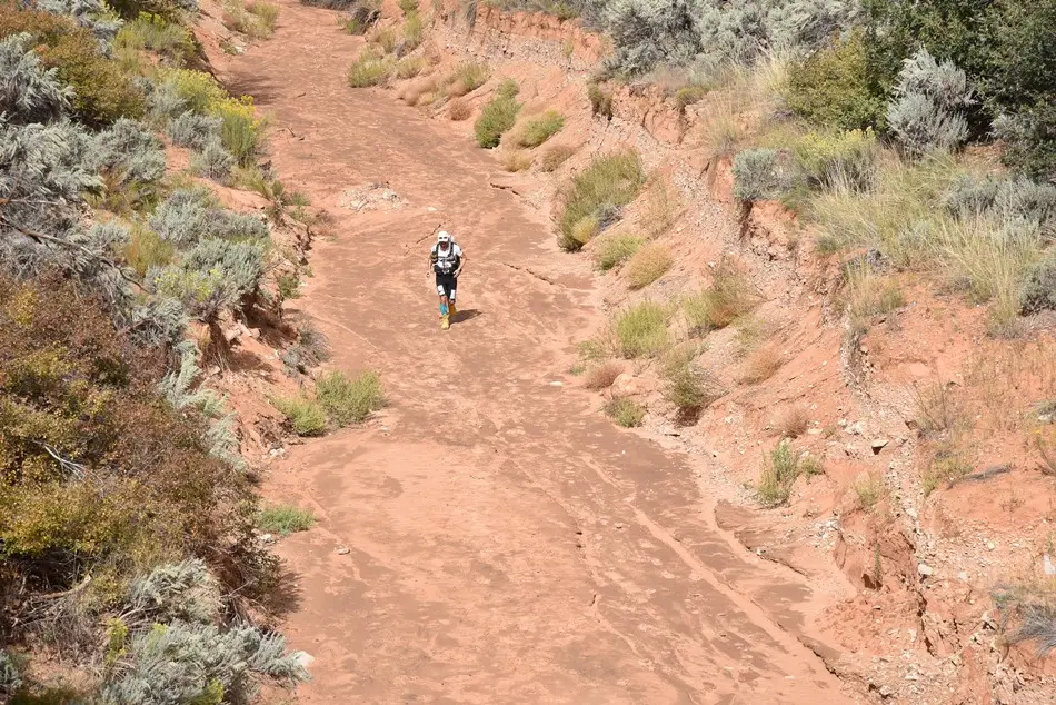 Oameni buni, asta a fost de departe cea mai grea etapă lungă din toate cursele pe care le-am făcut până acum. Și asta datorită terenului pe care am alergat, în proporție de 75% nisip fin (știți voi, de se afundă piciorul până la gleznă). Cine ar fi crezut că o etapă care era descrisă în course book ca fiind una cu relief divers, se va transforma într-una așa de greu de parcurs. Acum să nu mă înțelegeți greșit, am avut de toate (munți, dealuri, canioane, pajiști cu cactuși) însă toate aveau mai devreme sau mai târziu de-a face cu nisipul. Știți pozele acelea cu munții și dealurile roșiatice din jurul Marelui Canion? Cine și-a imaginat că o dată ce urci pe stânci, sus, pe platou e plin de nisip, la fel și potecile care coboară. Peisajele în schimb îți tăiau respirația. A fost o etapă în care am tras și n-am stat la poze și filmări decât așa pe fugă pentru că nu puteam să nu aduc acasă o fărâmă din ceea ce am văzut ieri.