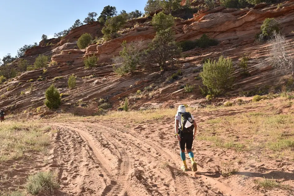 La km 65, se întunecase, eram toți cu frontalele pornite și am intrat în Coral Pink Sand Dunes Park. Ca și cum până atunci alergasem pe tartan. Fraților, le-am numărat. Au fost 31 de dune, mai mari sau mai mici, după pofta fiecăruia. Ce de înjurături se auzeau în jurul meu. Englezii ăștia însă nu au imaginație. Foloseau doar două cuvinte mari și late. Când m-am pornit eu, nu m-am repetat un sfert de oră 🙂