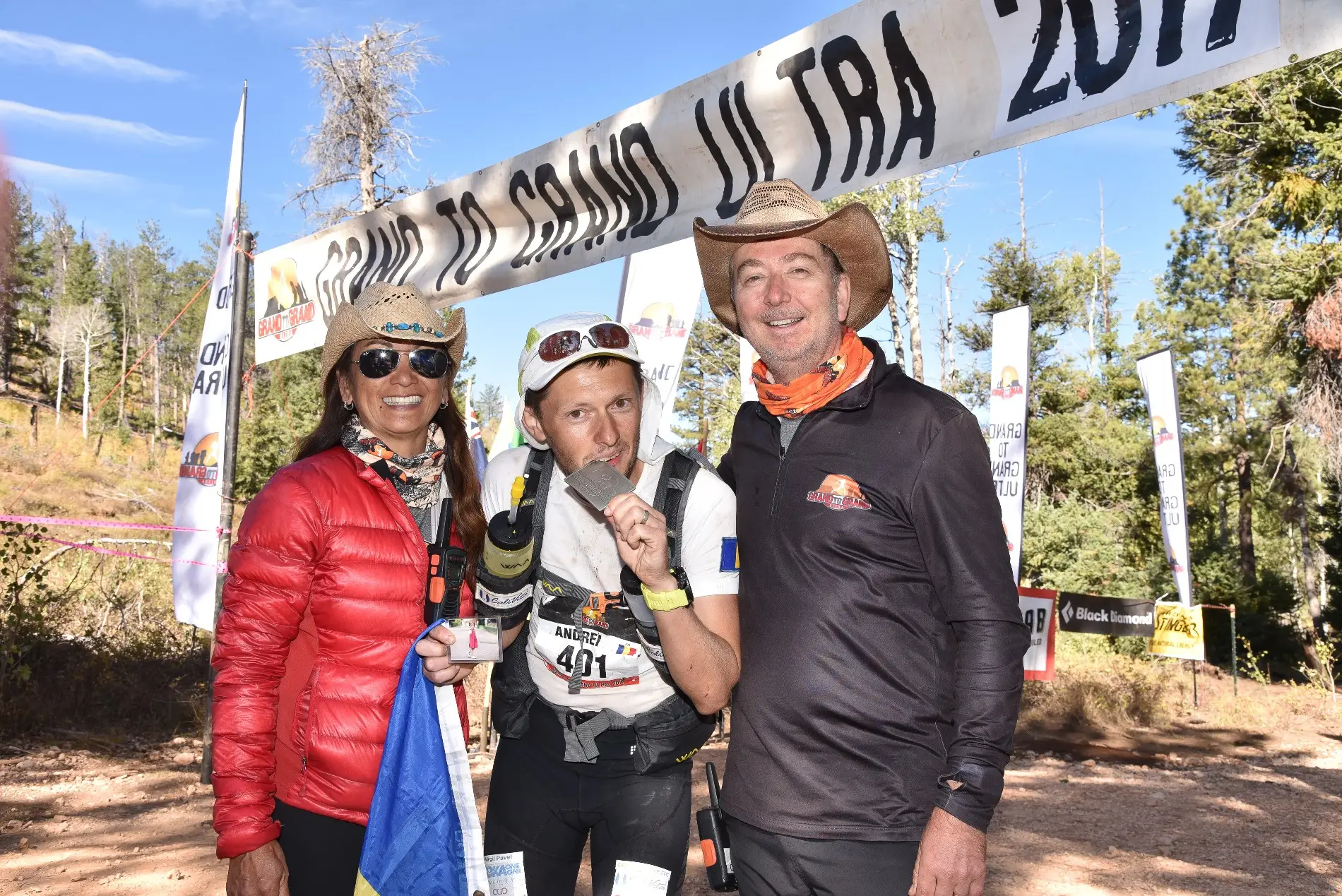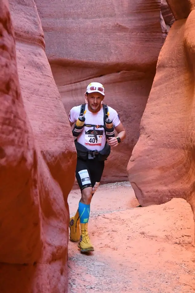 După ce timp de o săptămână mă obișnuisem cu tremuratul de frig noaptea, am zis că mai rău de atât n-are cum să fie. Ei bine noaptea trecută a fost cea mai friguroasă de când am ajuns aici și asta pentru că am avut tabăra la 2077m altitudine. N-are rost să intru în detalii legate de somn că nu prea a fost somn însă un singur gând mi-a ținut de cald toată noaptea și anume că mai rămăseseră de făcut doar 12km și cursa era gata. Cum locurile în top 10 erau deja stabilite și nu prea se mai puteau întâmpla răsturnări de situație mi-am propus ca ultima etapă să fie despre bucurie, admirație și recunoștință că mă aflu într-un loc magic în care mi-aș dori din tot sufletul să ajung și cu familia într-o bună zi. Așadar urmau 12km de urcare până la aproape 2700m, pe Grand Staircase de unde trebuia să admirăm traseul parcurs întreaga săptămână. Astăzi n-am mai simțit presiunea concursului ci doar relaxare și fericire pură pentru ce vedeam la tot pasul. Am trecut linia de sosire cu steagul României și poza fetiției și soției mele în mâini și m-am aplecat și am sărutat Grand Staircase mulțumind în gând acestei minunate părți a Americii că a fost bună cu mine și m-a “lăsat” să termin întreg această cursă. Am fost felicitat de organizatori ca fiind primul român care a terminat Grand to Grand și mi s-a oferit faimoasa nu medalie ci cataramă de curea. Așa au americanii la multe curse cu tradiție. Iar catarama chiar se poate purta la orice curea. “Congratulations Andrei! May you wear your buckle with pride!” (Felicitări Andrei! Să porți catarama cu mândrie!)