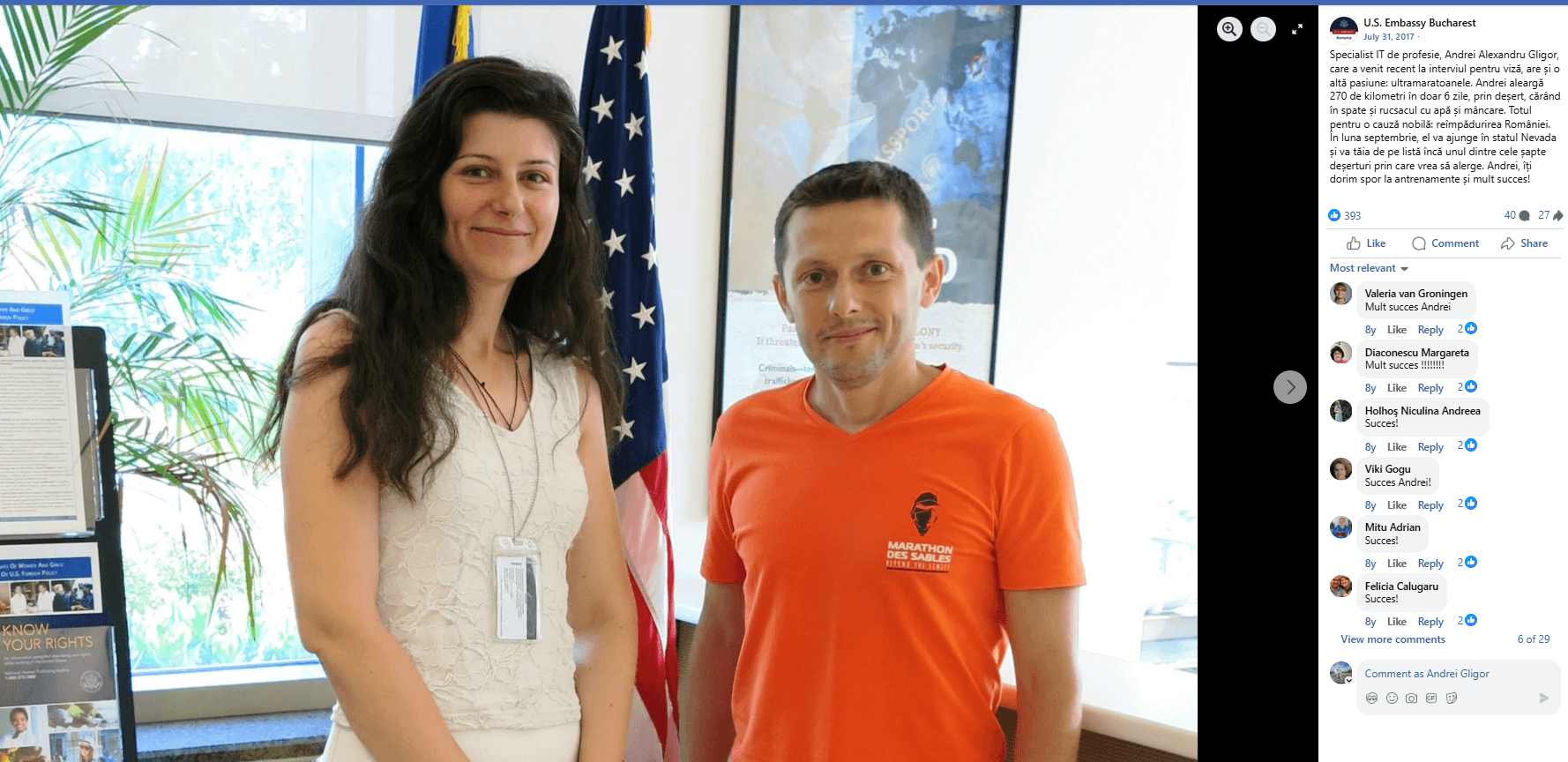 Era pentru prima oară când vizitam Statele Unite așadar aveam nevoie de viză și aveam oaresce emoții. M-am dus la interviu cu diplome de la alte curse, cu invitație din partea organizatorilor și pregătit să țin un discurs lung despre proiectul CaliVita 7 Deserts și cele 7 curse extreme la care m-am înhămat. Am fost în schimb plăcut surprins când totul a durat extrem de puțin. Nu am apucat decât să spun că sunt înscris la o cursă de 273km ce are loc în statele Utah și Arizona și după felicitările de rigoare și mirarea de pe chipul persoanei cu care am dat interviul, răspunsul a venit în două secunde: “Felicitări, viza dumneavoastră este aprobată”. Am răsuflat ușurat și mă îndreptam bucuros spre ieșirea din ambasadă, când un ofițer de securitate m-a oprit spunându-mi: “Domnule Gligor, vă rog să rămâneți pe loc. Va veni cineva să vorbească cu dumneavoastră”. Într-o clipă prin minte mi s-au derulat tot felul de scenarii demne de cele mai tari filme americane. Știți voi, acelea când ești pus jos și controlat pe toate părțile. Nu înțelegeam de ce nu pot ieși din ambasadă dacă totul a fost în regulă. Am așteptat cred 5-10 minute, care vă spun sincer că mi s-au părut ore. După 10 minute apare domnișoara cu care dădusem interviul și își cere scuze că am fost oprit de agenții de securitate însă povestea mea li se păruse extrem de frumoasă astfel încât doreau să îmi ceară permisiunea de face o poză împreună și a o posta pe pagina oficială de facebook a ambasadei. Instant mi-a revenit culoarea în obrajii care deveniseră palizi, picioarele nu mai tremurau și am putut chiar să și schițez un zâmbet. Ce sperietură am mai tras! De fapt se poate vedea și în poză că nu era râsul meu 🙂 Apoi am stat la povești câteva minute și am detaliat puțin proiectul și de ce fac ceea ce fac. Am plecat de la ambasadă încărcat cu energie pozitivă și cu primul pas către Grand to Grand bifat: viza!