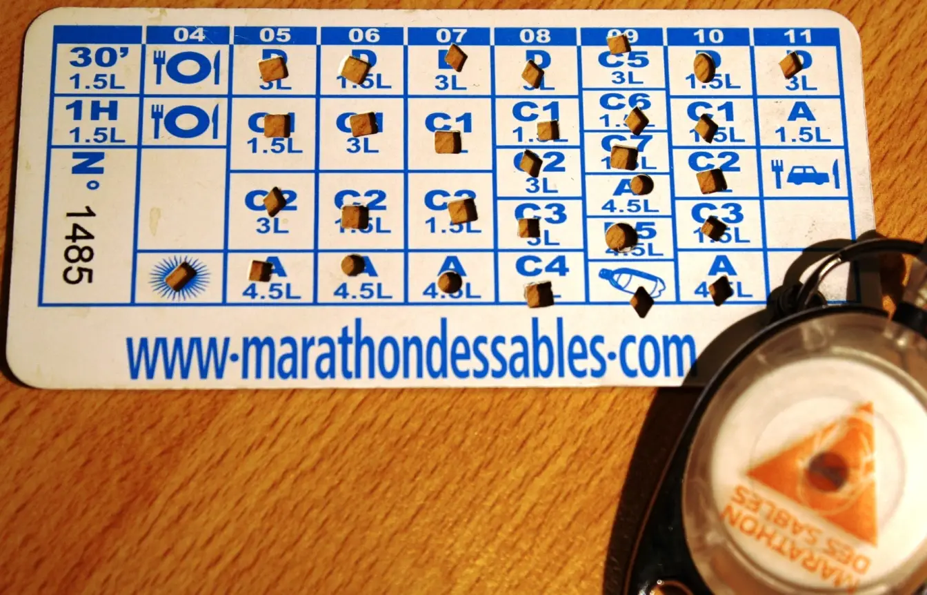 Dupa ce am “scapat” de geanta, am intrat in cortul organizatorilor pentru verificarea echipamentului obligatoriu si cantarirea rucsacului de cursa. Confrom regulamentului, acesta poate fi intre 6,5kg si 15kg. Al meu a avut 9. Nu-i nici mult nici putin, avand in vedere ca la asta se mai adaugau si cei 1,5L de apa dispusi in cele doua bidoane din fata. Insa imi facusem un calcul si pe masura ce zilele treceau, greutatea lui avea sa scada cu aproximativ 800gr/zi – reprezentand mancarea, gelurile si prafurile izotonice folosite in fiecare etapa. Cu ocazia verificarilor am primit si cartela de apa!