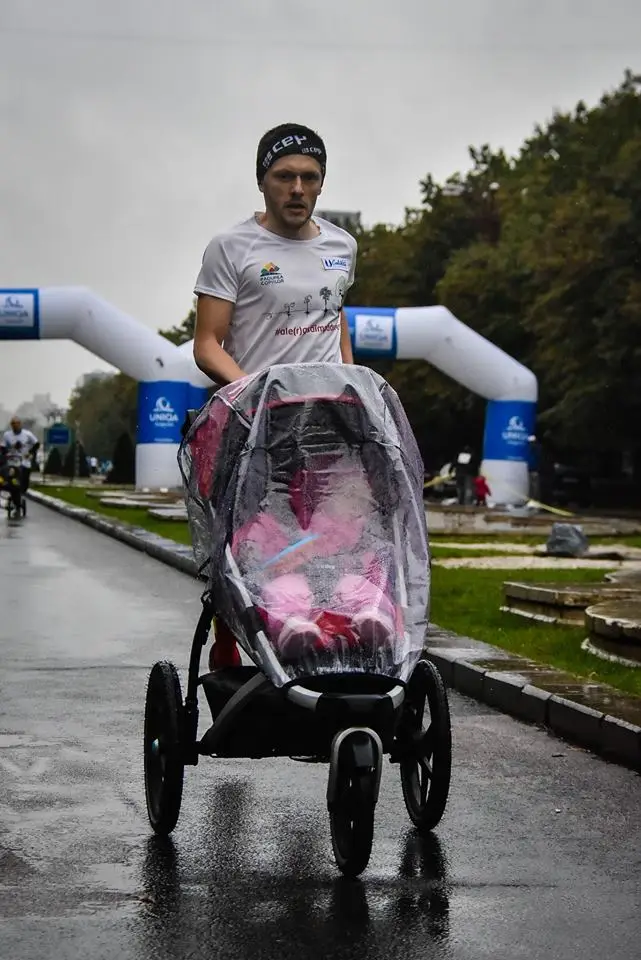 Am participat si eu cu Sara la cursa organizata de SAMAS, Jogging in scutece, special conceputa pentru parintii care alearga cu caruciorul si care a presupus parcurgerea unei distante de 900m. Mi-a facut placere sa vad la start persoane cunoscute, in postura de tatici impingand carucioarele cu bebelusii lor. Desi ploua si era destul de frig afara, Sara astepta cuminte in carucior inceperea cursei, nestiind probabil ca avea sa se termine foarte repede. Probabil era obisnuita sa “alerge” mai mult, deoarece in primavara am parcus impreuna cei 21km de la Semimaratonul International Bucuresti. Dupa 3m20s treceam primii linia de sosire iar bucuria de pe fata ei m-a facut sa-mi dau seama ca a meritat sa “apas” un pic pe pedala 🙂 E foarte adevarat ca m-a ajutat si caruciorul, un model special pentru alergare. A urmat apoi festivitatea de premiere unde Sara a primit din partea partenerului Noriel o punga plina cu jucarii, pampers, o diploma si o medalie.