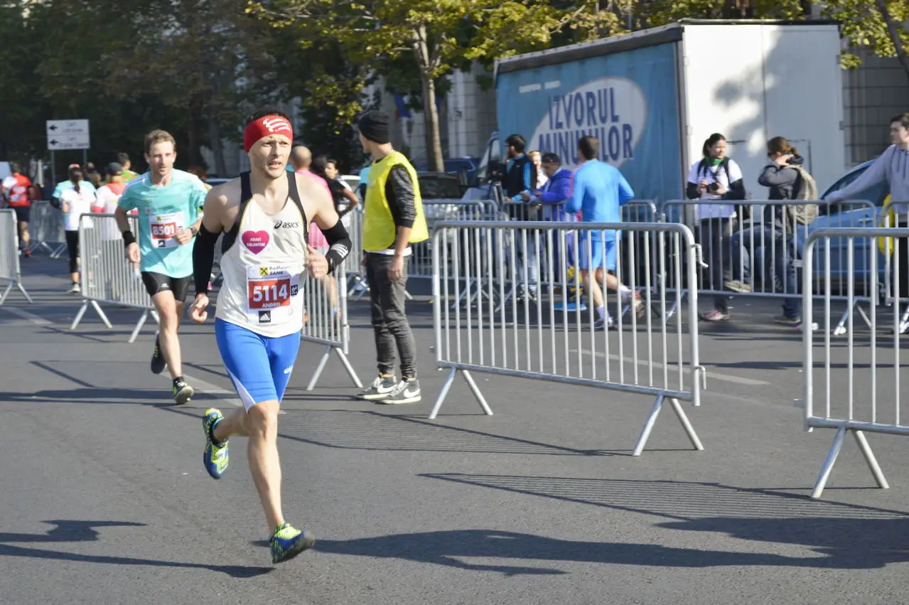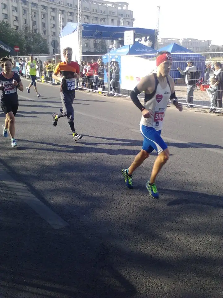Dupa 3 km am inceput sa vad si altceva in afara tricourilor celorlalti. Am vazut dintr-o data ca sunt oameni pe margine. Unii care strigau si ne incurajau: “Uite si la astia… alearga 42 de km de nebuni, doar ca sa ajunga tot in locul din care au pornit”; sau “Alta treaba nu aveti? Din cauza voastra nu pot eu sa trec strada”. Ii las in urma. Ce stiu ei? Brusc, vad bulevardul Unirii. Normal ca il vad, doar pe al alerg. Il vad des, dar de data asta, alergand pe mijlocul lui, il vad altfel. Pare mult mai lung, si imi dau seama ca nu e plat, cum credeam. Mai trec cateva minute si cativa km, si vad doi oameni alergand o cununa de baloane. 4:30. Ce incet alearga astia… timpul asta nu e de mine. Apare si un punct de hidratare. Ce ne-au invatat antrenorii nostrii? Ca trebuie sa ne hidratam. Iau paharul, si imi hidratez mai intai cu grija tricoul, apoi ultima ramasita de apa imi ajunge cumva in gura, si de acolo pe trahee. Lasa ca ma hidratez la urmatorul post… Ma uit in jur, aproape toti aau numere rosii. Semi, ma gandesc. Nu sunt in stare sa alerge un maraton intreg, ca mine! Ma simt mandru, si incarcat de energie. Atata energie, incat in cateva minute trec de pacerii de 4:15, cu ideea sa ii ajung repede pe cei de 4:00. Ii ajung, si il intreb pe unul din ei „Domnu, stiti cumva unde sunt pacerii de record mondial?“ Toata lumea rade, iar cineva raspunde “Nu i-am vazut, cred ca nu s-au trezit la timp azi”; “Si-or fi uitat cip-ul” le zic eu gandindu-ma la o anecdota cu un triatlonist care a mers cu bicicleta fara cip. “Sau poate sunt mai in fata… ma duc sa vad, poate ii gasesc”. Nu ma mai gandesc la nimic, si alerg in ritm constant, pana vad un banner “mai ai un km”. Frumos banner, dar e valabil doar la tura urmatoare. Am facut jumatate de maraton, ma apuca mandria, dar si oboseala, apoi vad ca pacerii de 3:45 sunt in spate, si ma simt iar plin de energie.