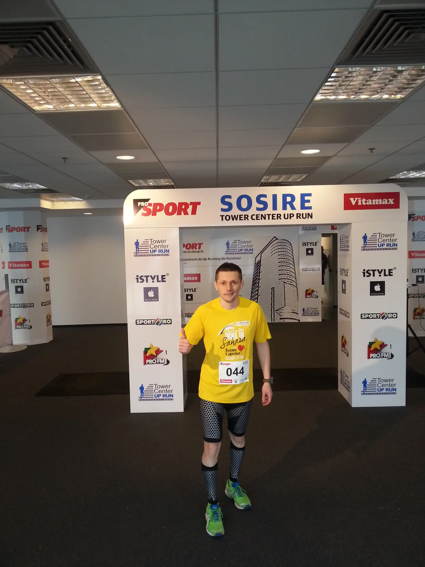 Urmand modelul american, cu diferenta ca noi inca nu avem cladiri asa de inalte, organizatorii au reusit sa puna la punct un eveniment de alergare cu totul inedit, unde au luat startul aproape 500 de alergatori. Totul s-a desfasurat intr-o cladire cu 22 de etaje (514 trepte) si pot sa spun ca au fost cele mai intense 4 minute de alergare din toate cursele la care am participat pana acum. Este un tip de efort cu totul diferit, deloc de luat in gluma. Desi in antrenamentele mele de alergare din ultima vreme am inclus si alergari pe scarile din parcuri (Carol, IOR) acelea nu s-au apropiat nici de departe de experienta Tower Center Run Up. Este un tip de alergare la care respiratia si efortul trebuie dozate aproape stiintific, ca sa reusesti sa termini cursa pe picioare. Desi ma gandisem la un mod de abordare (si anume 3 etaje alergare din 2 in 2 trepte, 1 etaj – treapta cu treapta), bineinteles ca in euforia startului n-am mai tinut cont de strategie. Am alergat pana la etajul 14 din doua in doua trepte, chiar am depasit 3 persoane, dupa care pur si simplu am simtit ca ma lasa picioarele si ca nu mai am aer. Pentru o clipa am avut tendinta de a ma opri si a continua sa urc normal pe scari. Insa in acel moment am simtit cum se blocheaza musculatura si stiam ca va trebui sa continui sa alerg pentru a impiedica blocajul. Asa incat am continuat sa alerg treapta cu treapta, incercand sa-mi controlez atat cat se mai putea respiratia. Pulsul o luase si el razna, ajungand pe la 180 bpm. Insa chiar atunci cand incepuse sa fie mai dificil, am vazut semnul pe care scria etaj 22 si stiam ca finisul e aproape. Am reusit sa termin cursa in 4:19. Cel mai bun timp