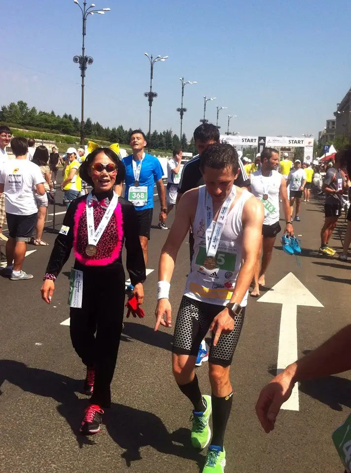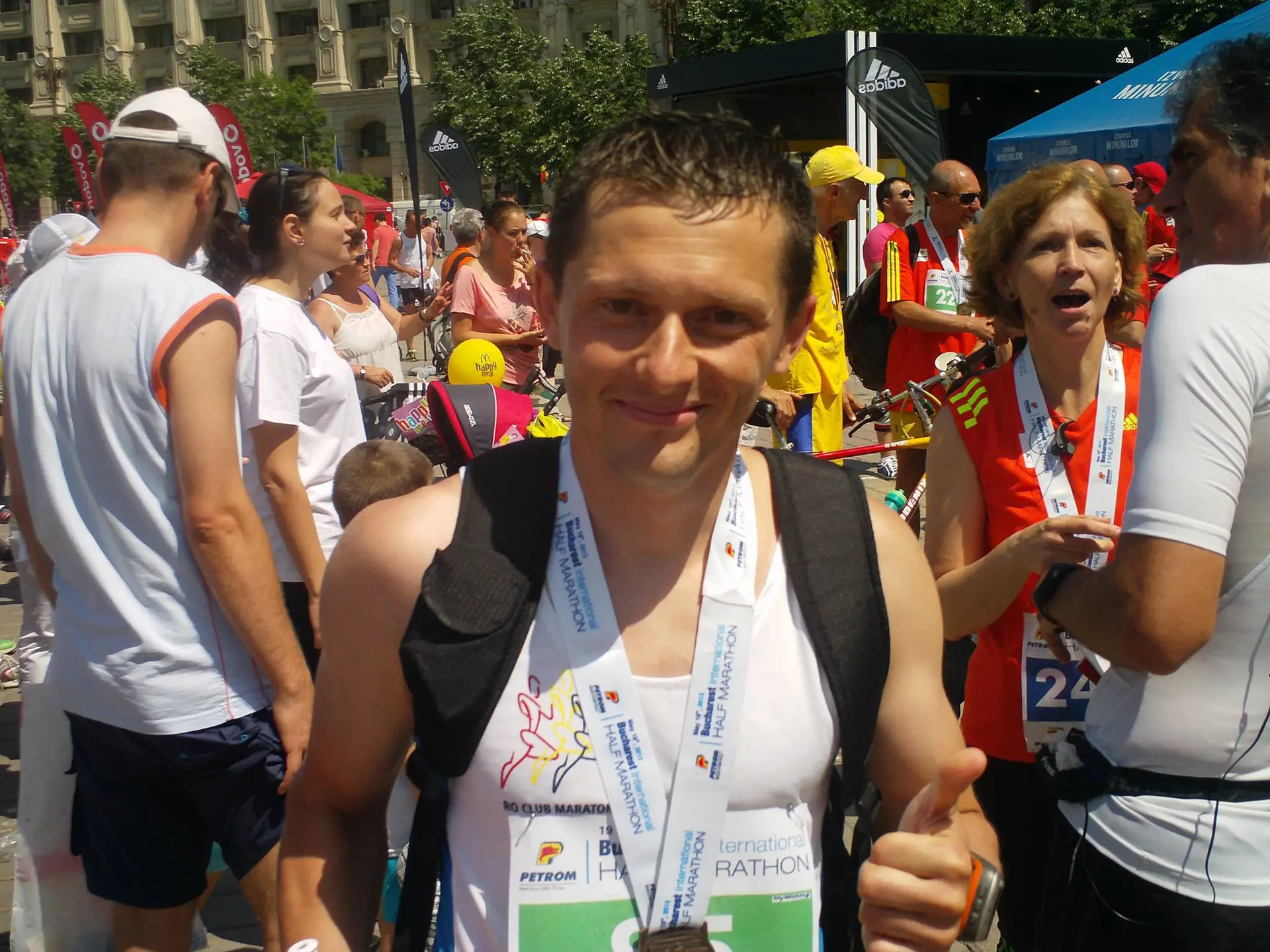 si constat ca sunt un pic peste timpul propus de 1h:35m – 1h:36m si incep sa accelerez. Nu stiu de unde am mai avut resurse. Nici sticla cu apa luata in fuga de la punctul de hidratare parca nu mai era de ajuns. Am continuat sa alerg la un ritm de pana in 4m 30s/kilometru si cu cat ma apropiam de finish cu atat viteza incepea sa creasca. Cand mai aveam aproximativ 800m, ma uit cu coada ochiului la ceas si ma sperii un pic pentru ca alergam cu 3m:40s/km. Am continuat asa, si dupa ultima intoarcere la dreapta se vede linia de finish. Sprint de final si …cam asta a fost: 1h 36m 06s! Pozitia 60 in clasamentul general din aproape 1500 de alergatori si pozitia 17 la categoria de varsta 35-45. Cu 52 de secunde mai bine ca cel mai bun timp al meu pe distanta de maraton! Nu reusisem o ora si jumatate insa eram fericit ca in conditiile de clima date am reusit totusi un personal best.