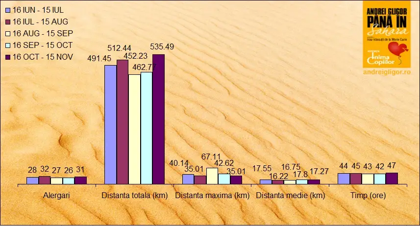 Am incheiat si cea de a cincea luna de cand am facut primul pas spre Sahara! Devine din ce in ce mai greu, atat pe plan fizic dar mai ales mental. Mintea incepe sa joace un joc periculos cu mine si in fiecare zi trebuie sa ma gandesc la motivele pentru care am pornit in aceasta aventura, ca sa pun incaltarile in picioare si sa ies la alergat. Vremea n-a fost nici ea din cea mai prietenoasa in ultima vreme, temperaturile scazute parca indemnandu-ma mai degraba sa raman in casa si sa savurez un ceai cald, decat sa alerg kilometru dupa kilometru pe aleile parcului.