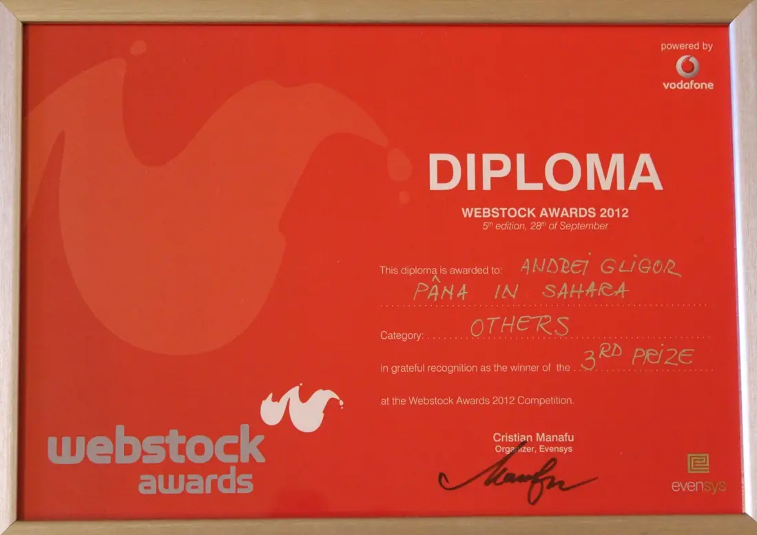 La inceputul lunii septembrie, discutand cu un bun prieten, Victor Kapra, despre proiectul “Andrei Gligor pana in Sahara”, si despre posibilitatile de a-l face vizibil in comunitatea online locala, m-a sfatuit sa il inscriu la premiile Webstock.