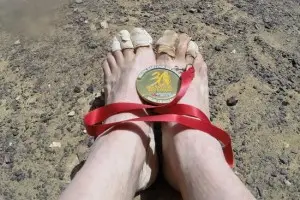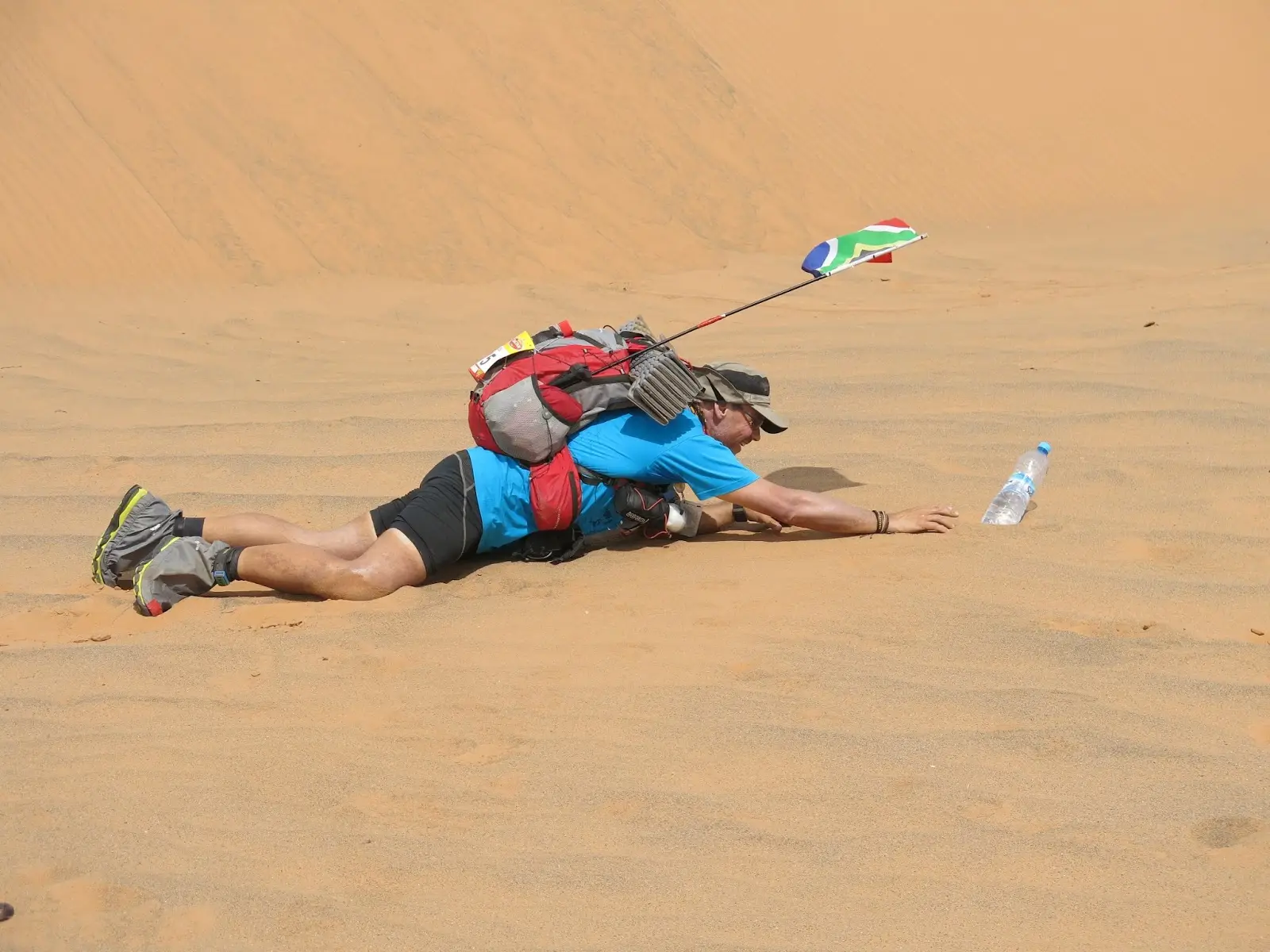 – apa este rationalizata la aproximativ 10-12 litri pe zi. Primesti 3L dimineata inainte de startul fiecarei etape, apa pe care trebuie sa ti-o imparti intre prepararea micului dejun, igiena personala si care trebuie sa iti ajunga pana la primul punct de hidratare din cursa (de obicei situat la 12-13km de start). Acolo mai primesti inca 3L pe care trebuie sa ii dramuiesti foarte bine astfel incat sa iti ajunga pana la urmatorul punct de hidratare unde mai primesti inca 1,5L. Iar la finalul etapei, primesti 3 sticle de 1,5L cu care trebuie sa te descurci pana a doua zi (spalat, preparat mancarea, hidratat). Teoretic s-ar putea crede ca 12L este o cantitate suficienta. Insa ritmul deshidratarii atunci cand alergi la 50 de grade celsius si cu greutate in spate, poate ajunge la 1,5L de transpiratie pe ora, conform studiilor efectuate de organizatori. Asadar cei 12L par ca sunt multi dar de fapt nu este asa.